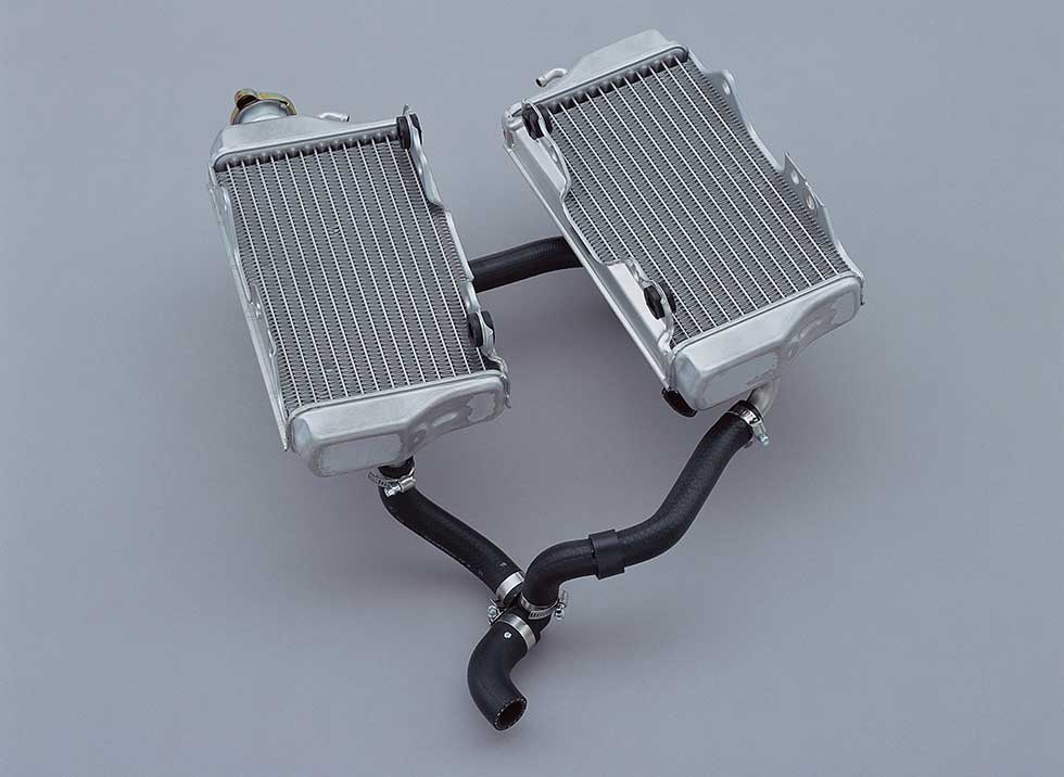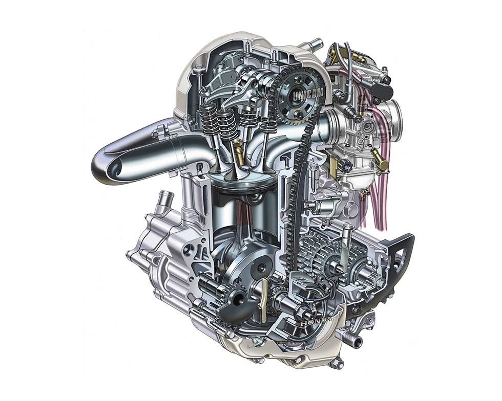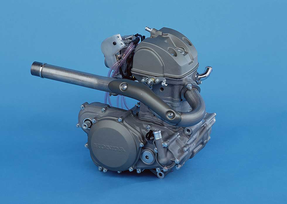 Looking ahead to the 21st century, Honda selected a newly developed water-cooled, four-stroke, OHC, four-valve single-cylinder engine with a displacement of 449 cm³. Compact and lightweight yet capable of high output, it would form the heart of a new generation of motocross machines.