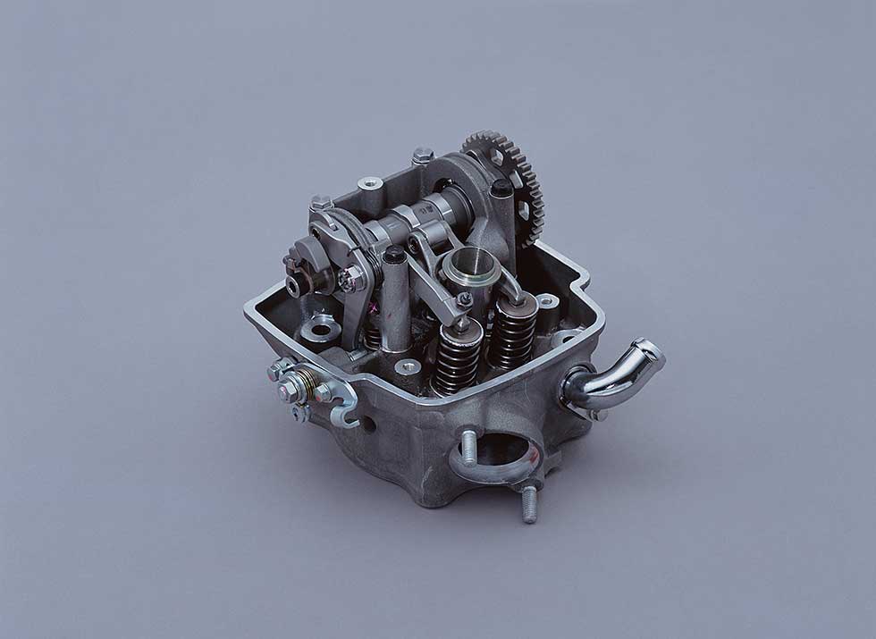 A single camshaft directly actuates the intake valves, while the exhaust valves operate through rocker arms. This layout enables higher engine speeds and greater output than conventional OHC systems while also contributing to a more compact cylinder head design.