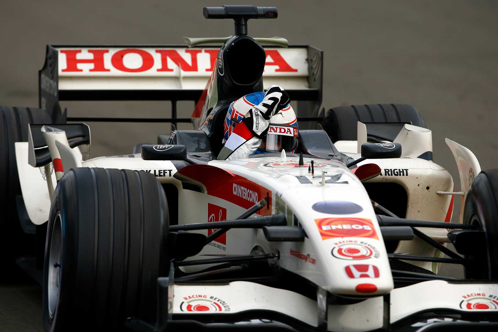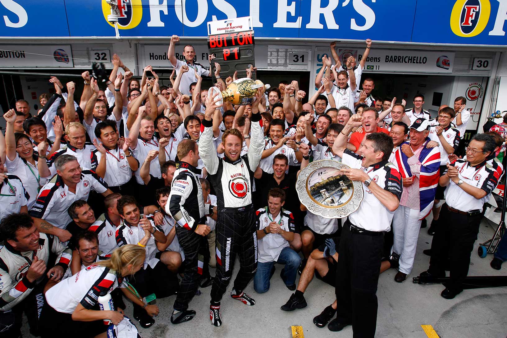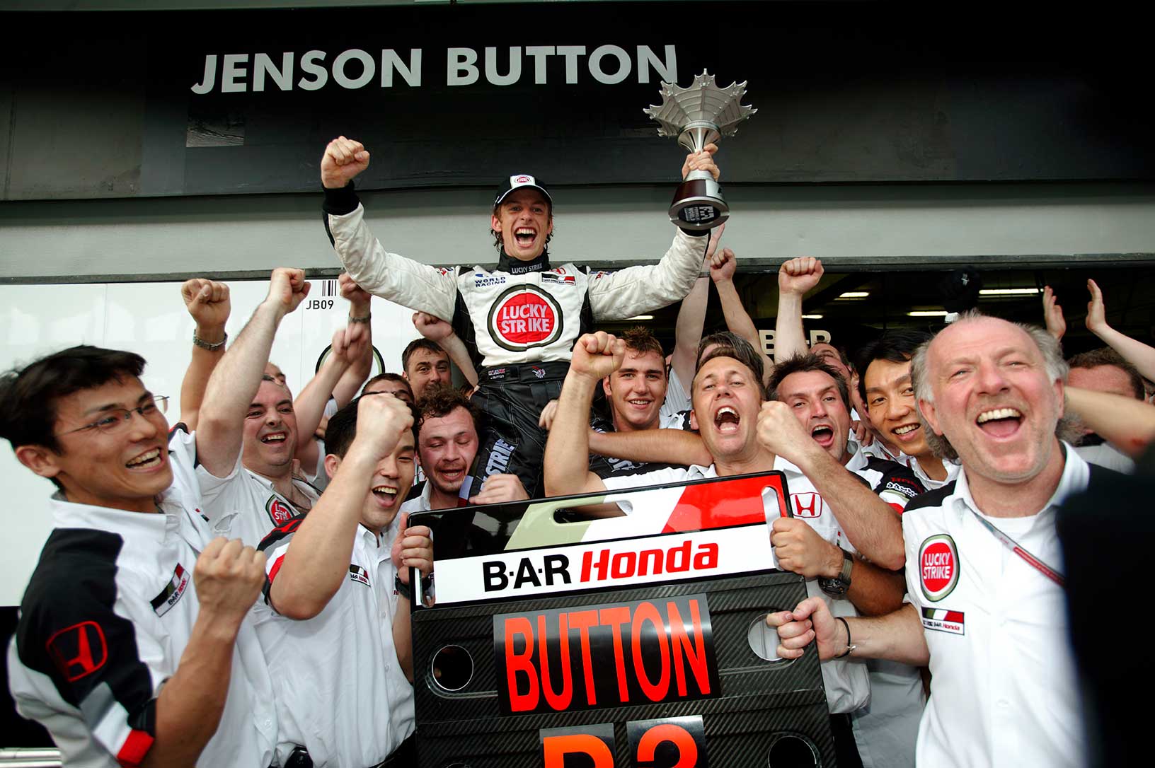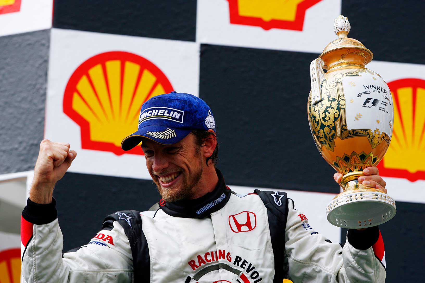 One iconic image. One iconic debut victory. The 2006 Hungarian Grand Prix provided unpredictable weather, but Jenson was the driver to master those conditions. The odds were against him, as a 10-place grid penalty dropped him to 14th on the grid, but his ability to read the evolving track saw him make his way through the field and claim the lead on lap 52 – providing Honda with their first victory as a constructor since 1967.