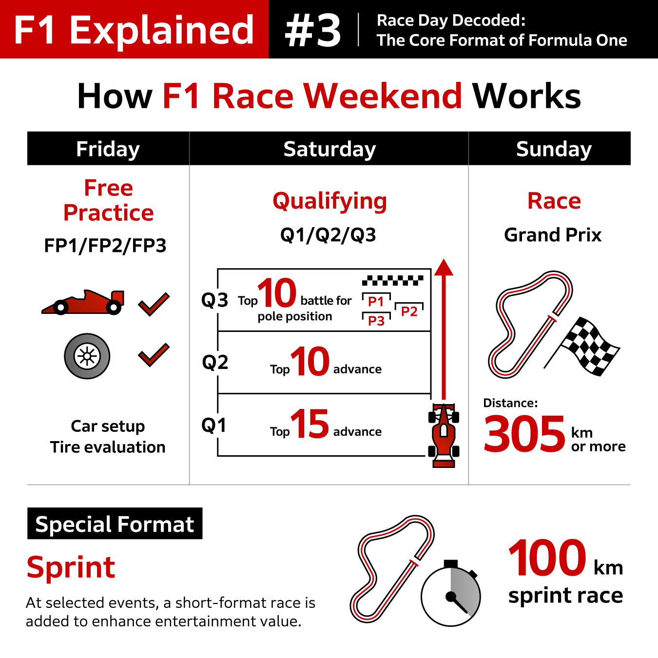 Formula 1 events follow a format consisting of Free Practice (FP) sessions, Qualifying (Q1–Q3), and the Race. A Grand Prix weekend generally begins on Friday and concludes with the race on Sunday.