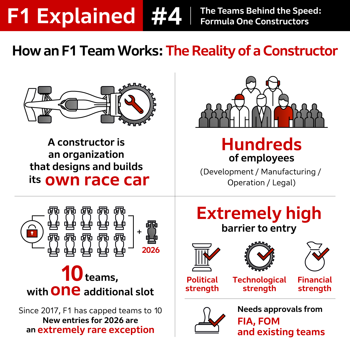 For many years, the number of teams competing in Formula 1 has remained at around ten, and since 2017 participation has been limited to 10 teams. This is because entry into Formula 1 requires approval from the Fédération Internationale de l’Automobile (FIA), Formula One Management (FOM) (formerly FOCA), and all existing teams. The barriers to entry are extremely high, requiring not only technical capability but also political influence and substantial financial resources. In 2026, Cadillac F1 Team will join Formula 1 as the 11th team. This represents a rare case in which a new entrant has successfully overcome these hurdles over an extended period of time. Most current teams, meanwhile, trace their origins to the acquisition and rebranding of previously existing teams.
