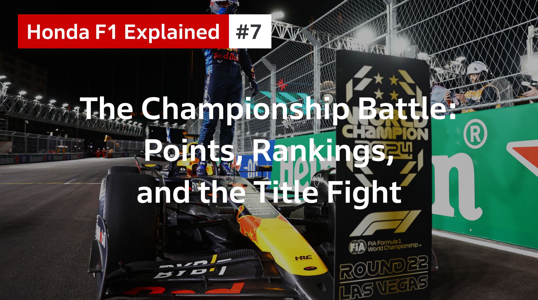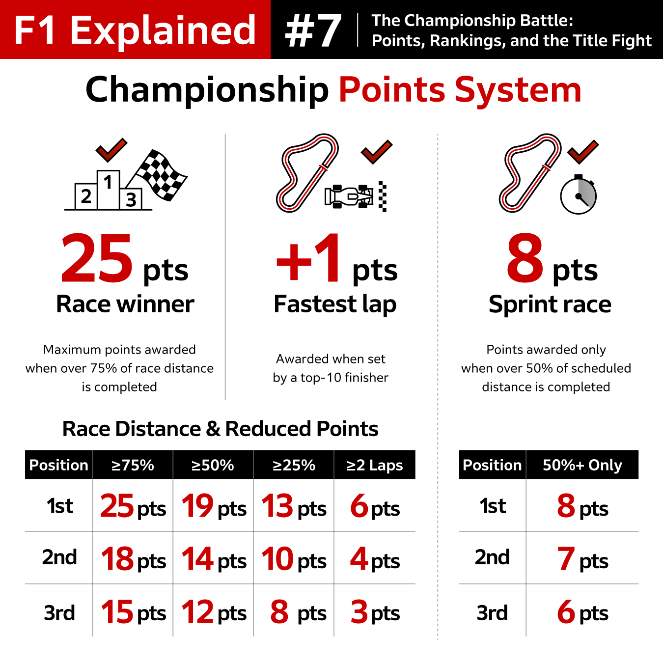 The Drivers’ Championship is decided by the total points scored by each driver over the season. The Constructors’ Championship is decided by the combined points scored by a team’s two drivers.