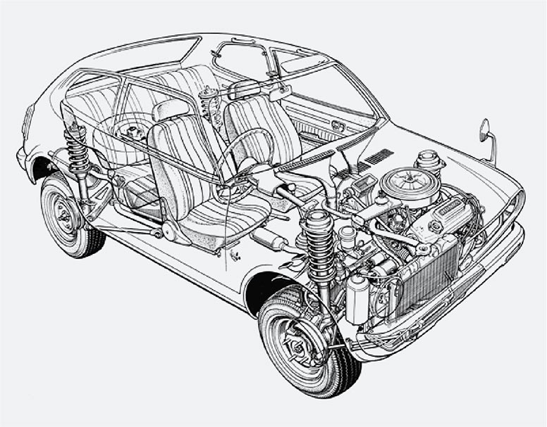 Perspective view of the first-generation Civic. The innovative trapezoidal body, compact transversely-mounted engine, and four-wheel independent strut suspension system, which was rare for FWD cars at the time, provided a spacious cabin.