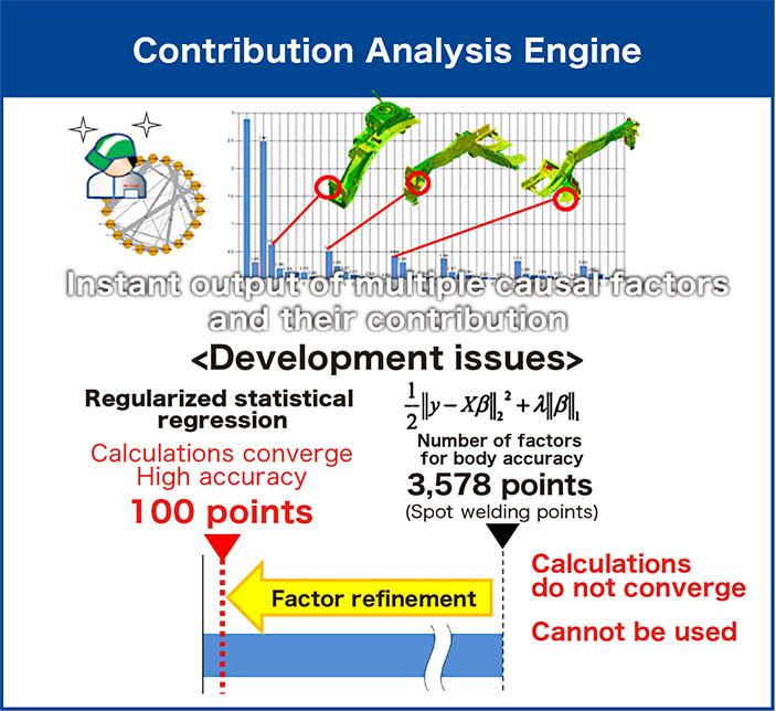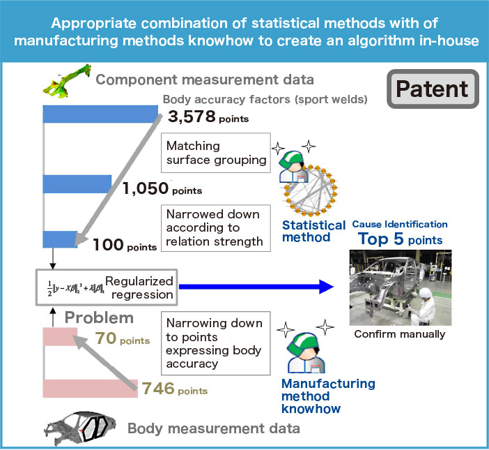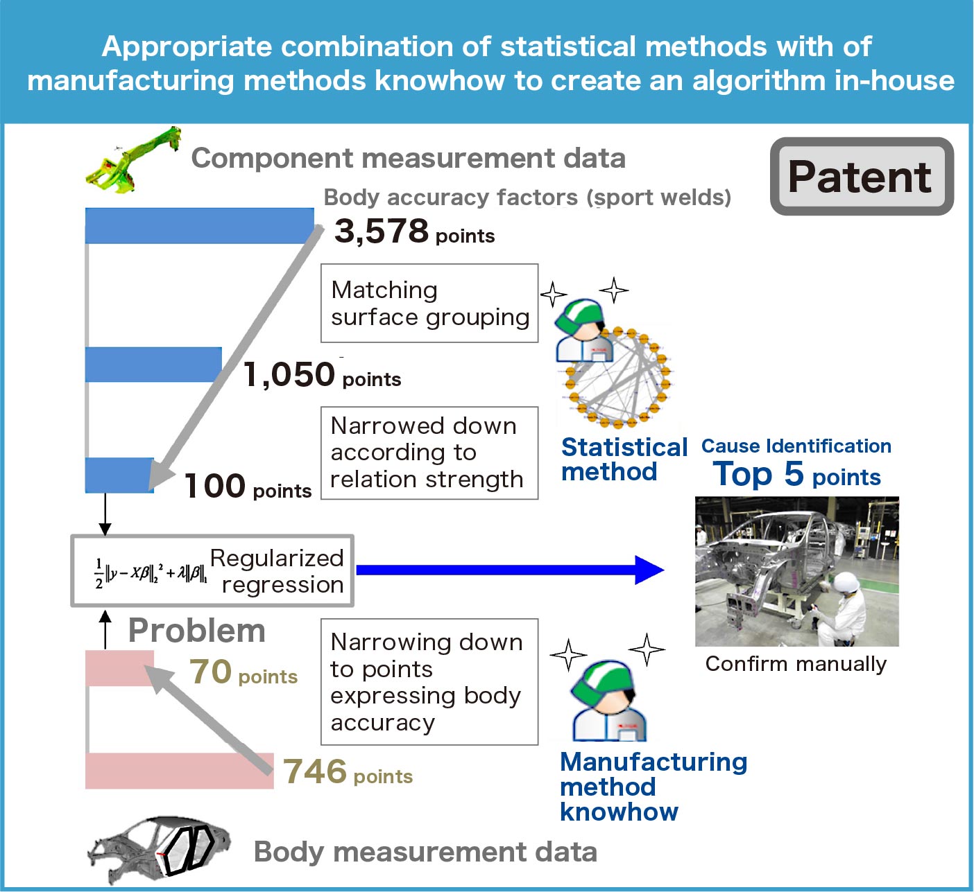 - A system developed by Honda that uses an original algorithm to narrow down the number of spot welding points from more than 3,500 in the welding process, to about 100 that are closely related to product cost, and then uses regularized statistical regression to narrow down to five spots to identify the cause. By checking these five spots with actual parts, defects can be identified at a speed that was impossible in the past.