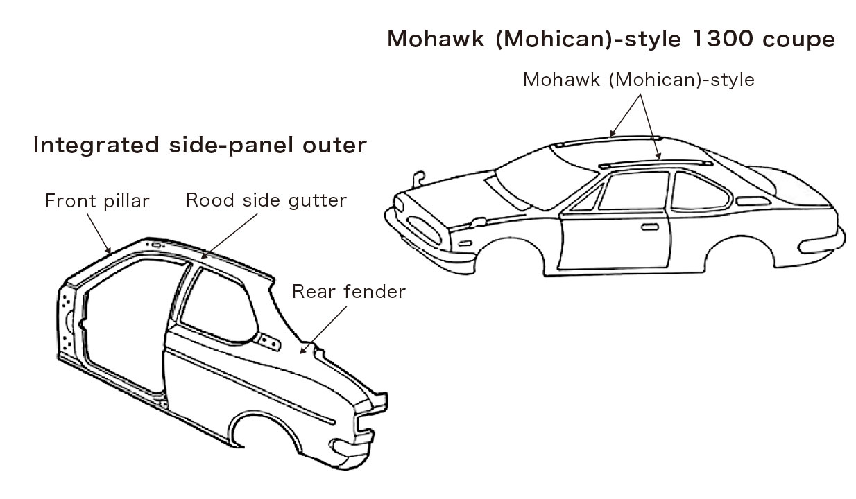 Both sides of the 1300 coupe’s roof were constructed with spot-welded grooves to which rubber was attached during the assembly process. The design resembled a Mohawk (Mohican) hair style, hence the name Mohawk Roof, which has since become a characteristic of Honda’s cars.