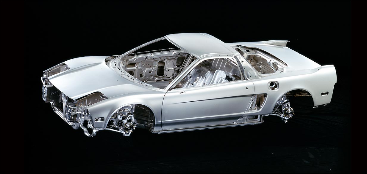 The NSX all-aluminum monocoque body, the world’s first for a mass-produced vehicle, was developed through the joint efforts of HGT, EG, and material manufacturers.