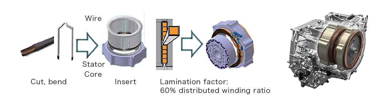 Around 2010, HGT began developing segment conductor wound motors, in which coils are assembled by processing copper wire with a square cross section, in parallel with distributed winding. At the same time, EG also began to study the feasibility of this motor, focusing on the advantages of the manufacturing process, such as realizing lightweight and compact motors at reduced production costs.