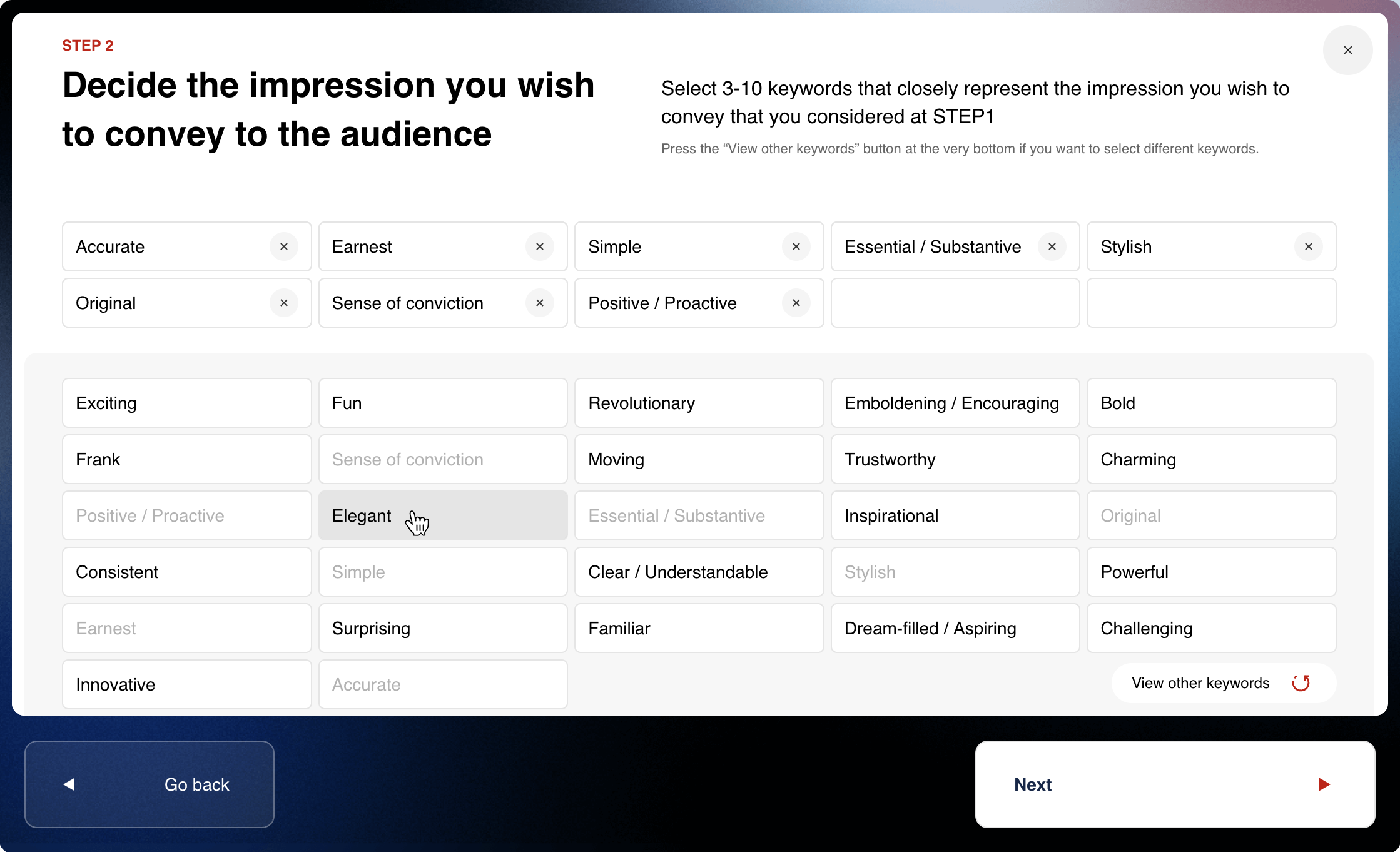 Select 3-10 keywords that closely represent the impression you wish to convey that you considered at STEP1