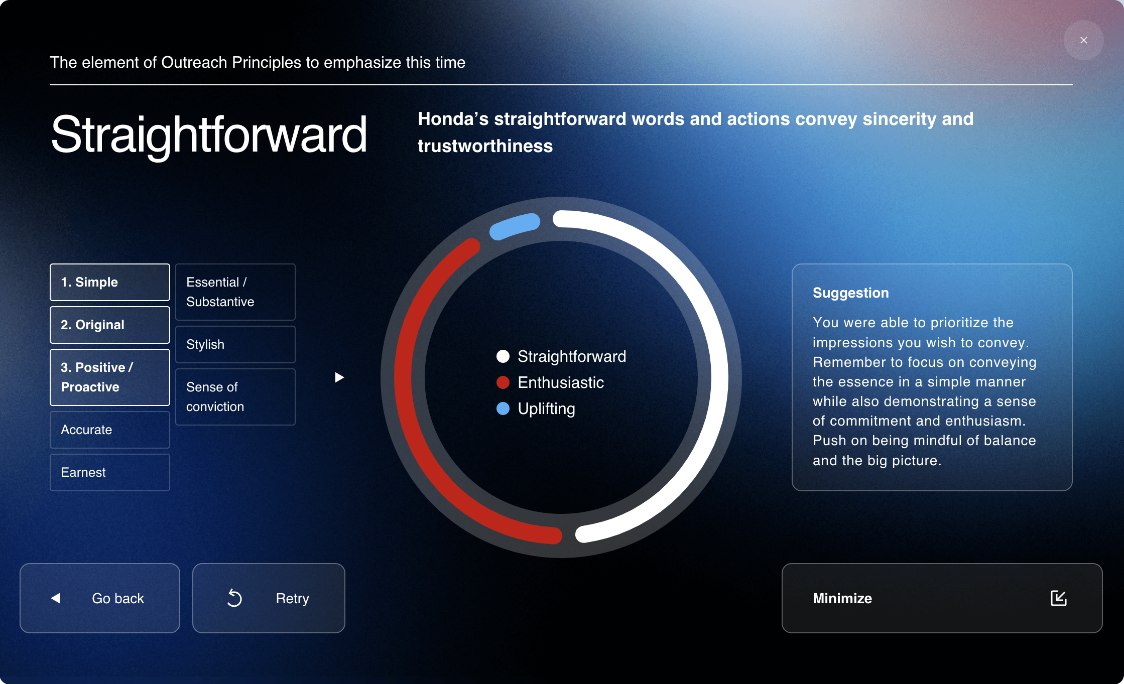 Outreach Principles describe the aspects of Honda Brand Personality as three elements: Straightforward, Enthusiastic, and Uplifting. We do not suggest selecting only one. Instead, an appropriate balance of the three elements should be considered given the medium, situation, purpose for information sharing and communications, and intended content and audience.