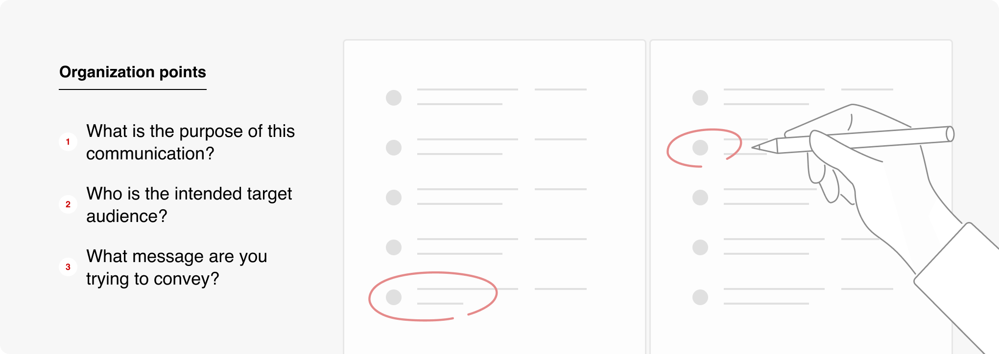 First, organize the information to be communicated and clarify the impression you want to convey.