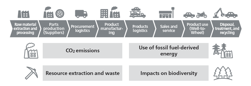 Honda identifies the main environmental impacts as: CO₂ emissions, use of fossil fuel-derived energy,