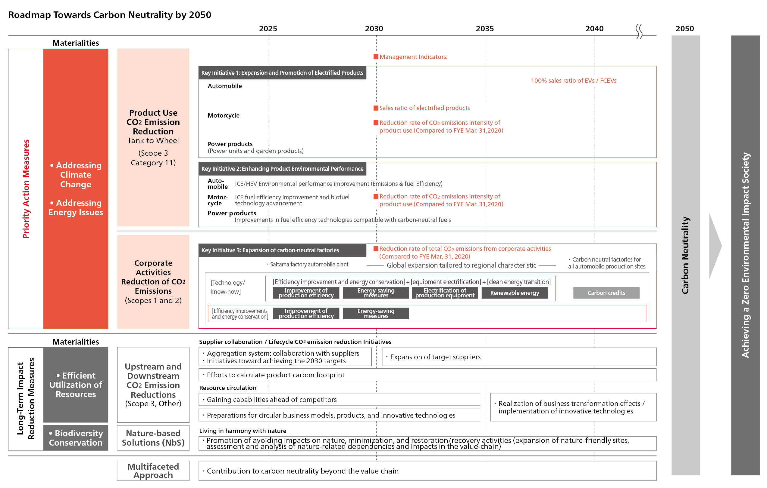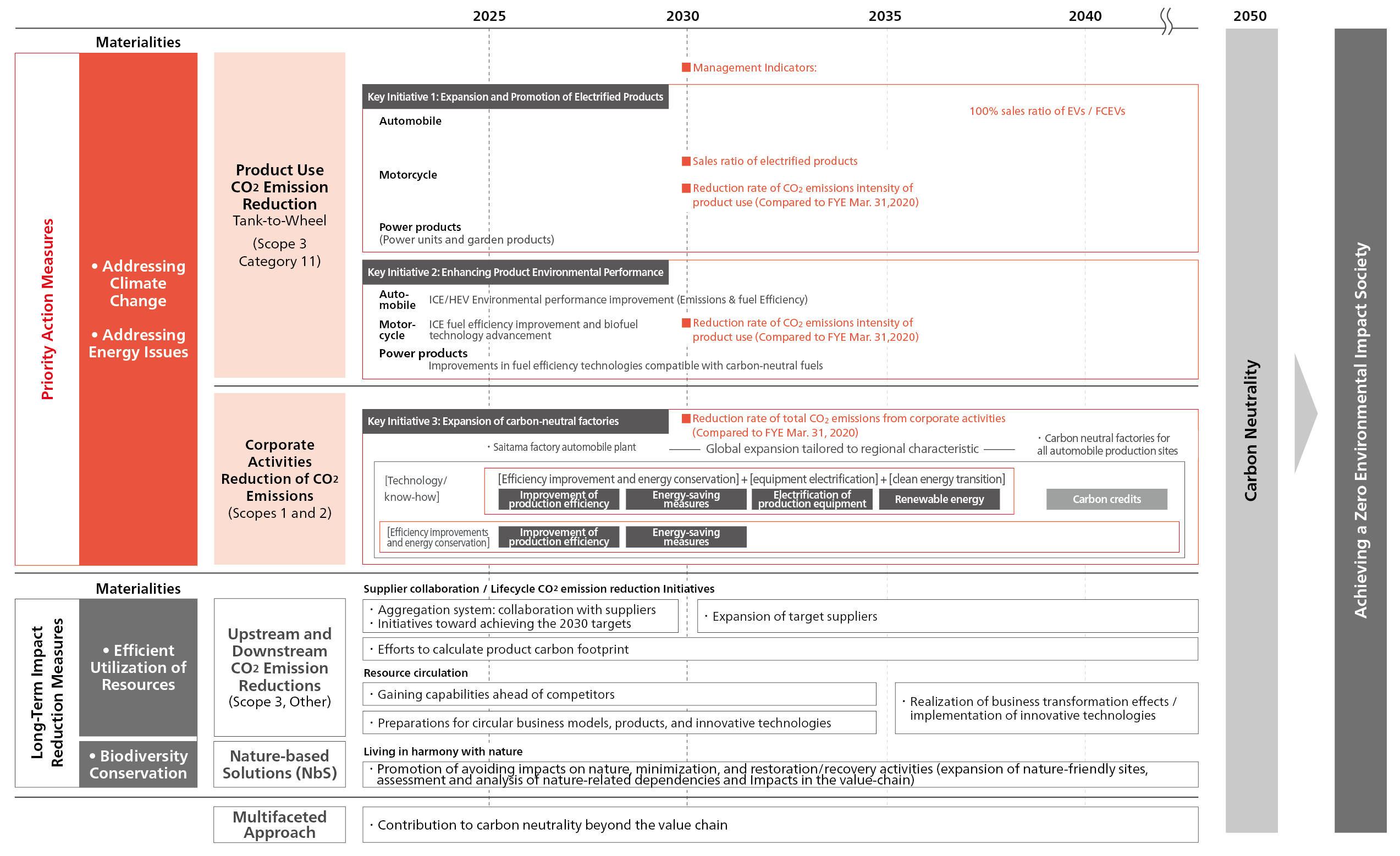 For long-term impact reduction measures related to the materiality of “efficient utilization of resources,” Honda is in the initial phase of preparing initiatives that may require business transformation beyond existing frameworks to achieve carbon neutrality, including efforts aimed at reducing CO₂ emissions in future upstream and downstream processes. We also recognize the importance of considering natural impacts, such as the materiality of “biodiversity conservation,” while advancing these initiatives. Therefore, Honda is aiming not only to achieving “carbon neutrality by 2050” but also to pursuing a long-term perspective toward realizing “a zero environmental impact society.”