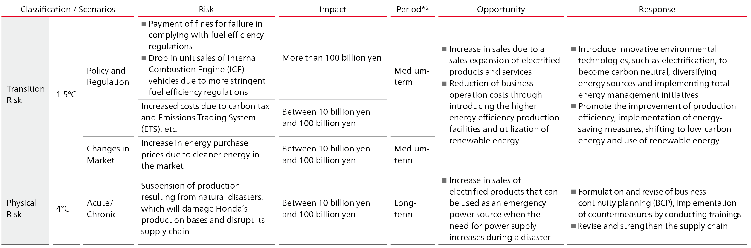 To evaluate and examine the impacts of climate change on our business, Honda has defined multiple scenarios and conducted the scenario analysis noted in the TCFD recommendations. This includes a scenario with significant policy transition which is based on the target laid out in the Paris Agreement “to limit the temperature increase to 1.5°C above pre-industrial levels” (1.5°C scenario) and a scenario where environmental regulations are not strengthened, leading to physical risks increase (4°C scenario).