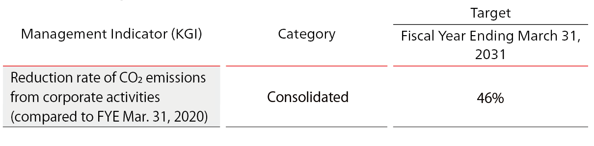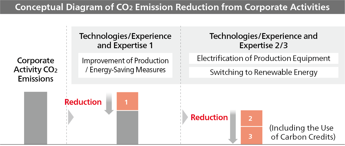CO₂ emissions from corporate activities (Scope 1 and 2) primarily result from direct CO₂ emissions during product manufacturing at production sites and indirect CO₂ emissions from the use of fossil fuel-based energy in the manufacturing and processing phases. We aim to reduce these emissions by improving production efficiency, electrifying equipment, and substituting energy sources with renewable energy.