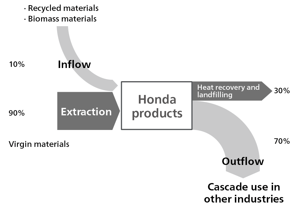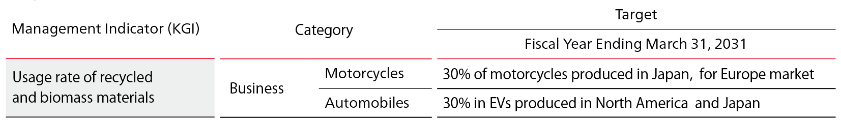 To maximize the inflow, we have set the new management indicator (KPI) “usage rate of recycled and biomass materials.” For motorcycle models produced in Japan for the European market, and for automobiles (EVs) produced in North America and Japan, in the Fiscal Years Ending March 31, 2031, we will aim for a target of 30%. To achieve this new target, we will further collaborate with suppliers of materials and parts in the upstream processes and apply recycled and biomass materials.