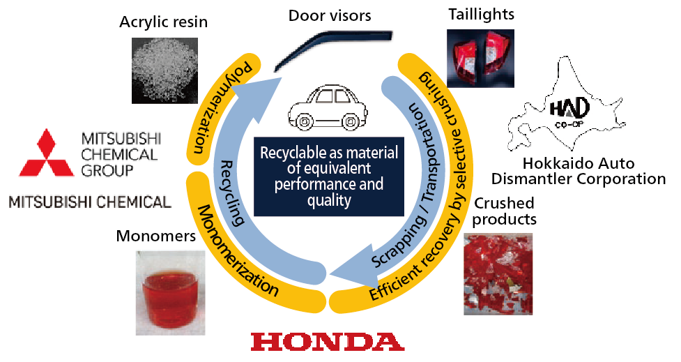 Honda, in collaboration with Hokkaido Auto Dismantler Corporation and Mitsubishi Chemical Corporation, conducted a demonstration experiment on the horizontal recycling of acrylic resin (from August 2021 to February 2022), establishing an efficient scheme for the entire operation.