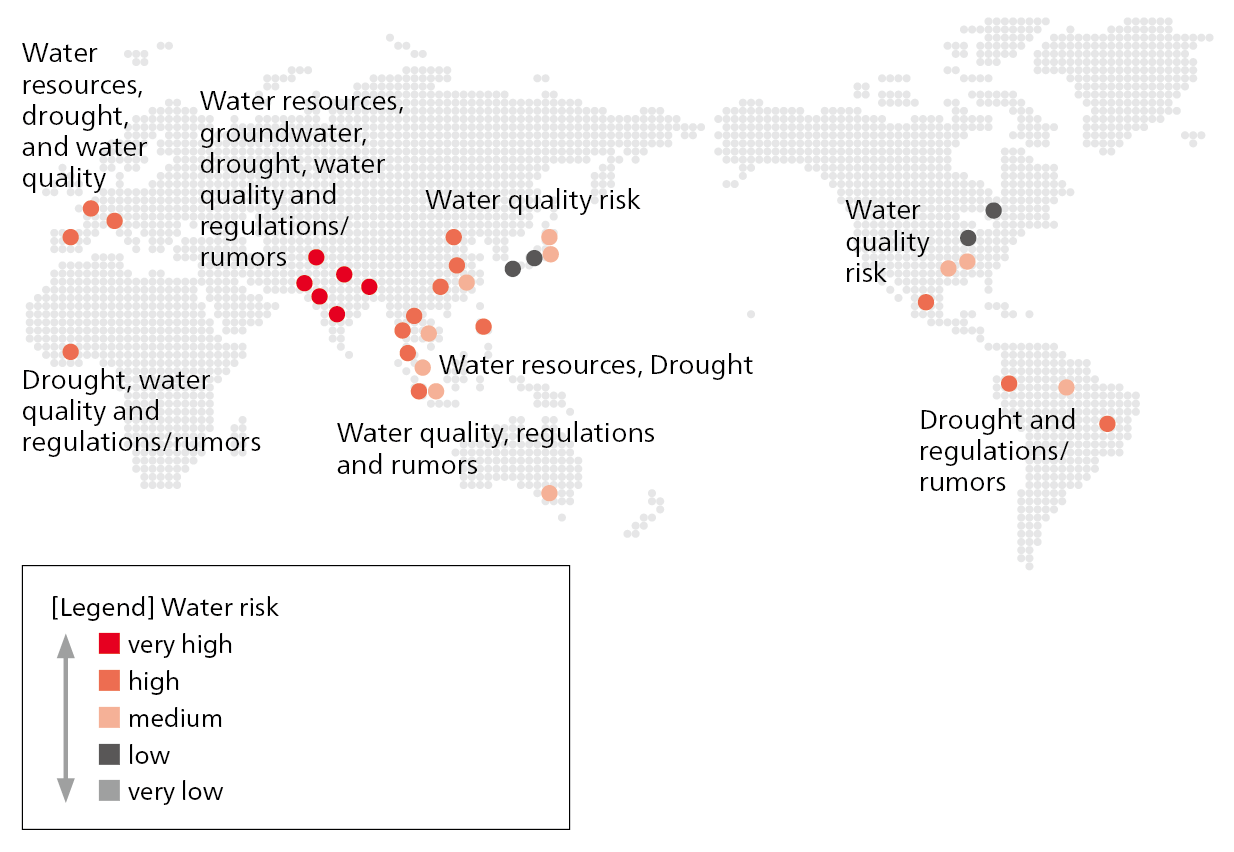 Water is a resource that is unevenly distributed by region and season, etc. At our production sites that use a large amount of water, we verify and identify risks in terms of water resources, groundwater, drought, water quality, regulations/rumors, etc. in the site areas using evaluation indicators such as AQUEDUCT and Water Risk Filter. We are thus promoting risk-based initiatives.
