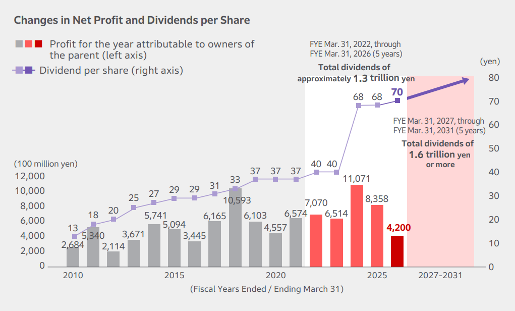 Honda positions shareholder returns as one of its most important management priorities. With respect to dividends, we plan to pay a total of about 1.3 trillion yen over the five years through the Fiscal Years Ending March 31, 2026, and approximately 1.6 trillion yen over the five years through the Fiscal Years Ending March 31, 2031. In May 2025, we decided to adopt DOE*4 as a new return indicator to enable more stable and continuous dividends while maintaining appropriate equity capital. Although the environment remains uncertain, including the impact of tariffs, management has expressed its commitment to stable and continuous shareholder returns, supported by a resilient business portfolio that has maintained profitability even under severe conditions in the past. From the Fiscal Years Ending March 31, 2026, we will strive to pay dividends with DOE of 3.0% as a benchmark. Looking ahead, we aim to further enhance both capital efficiency and dividend levels.
