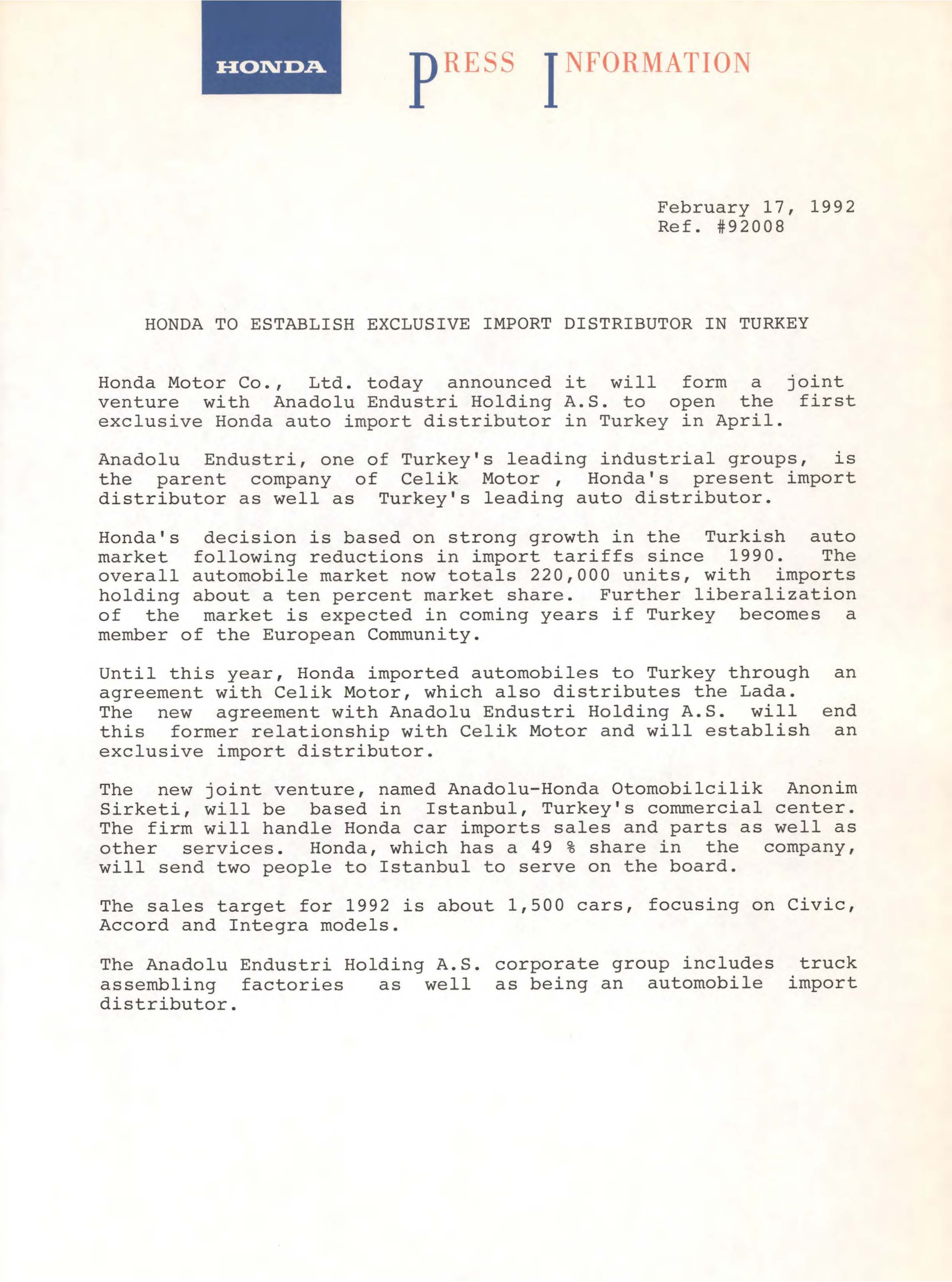 HONDA TO ESTABLISH EXCLUSIVE IMPORT DISTRIBUTOR IN TURKEY