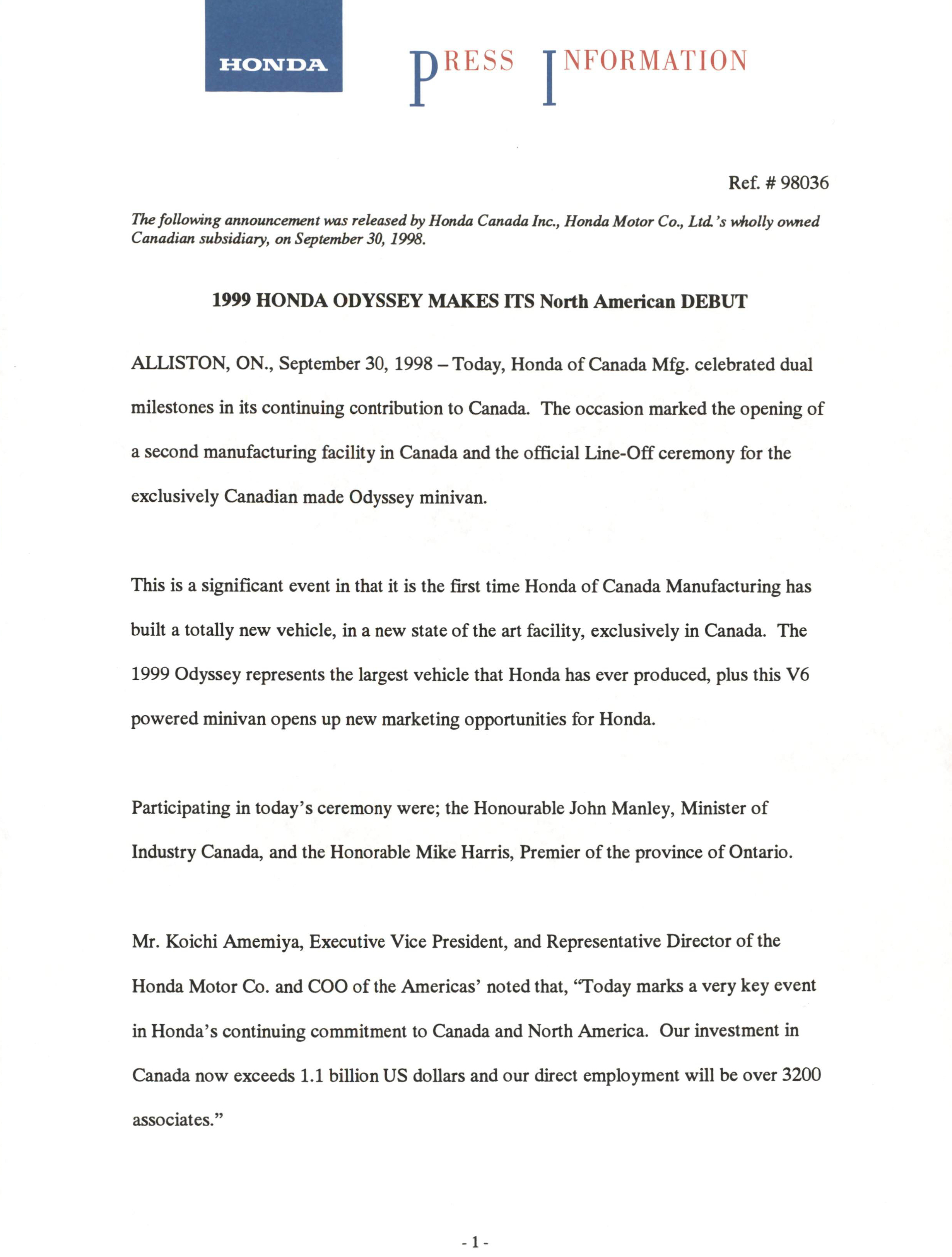 Sep 30, 1998 News Release 1999 HONDA ODYSSEY MAKES ITS North American DEBUT Read the full press release in PDF (520 KB)