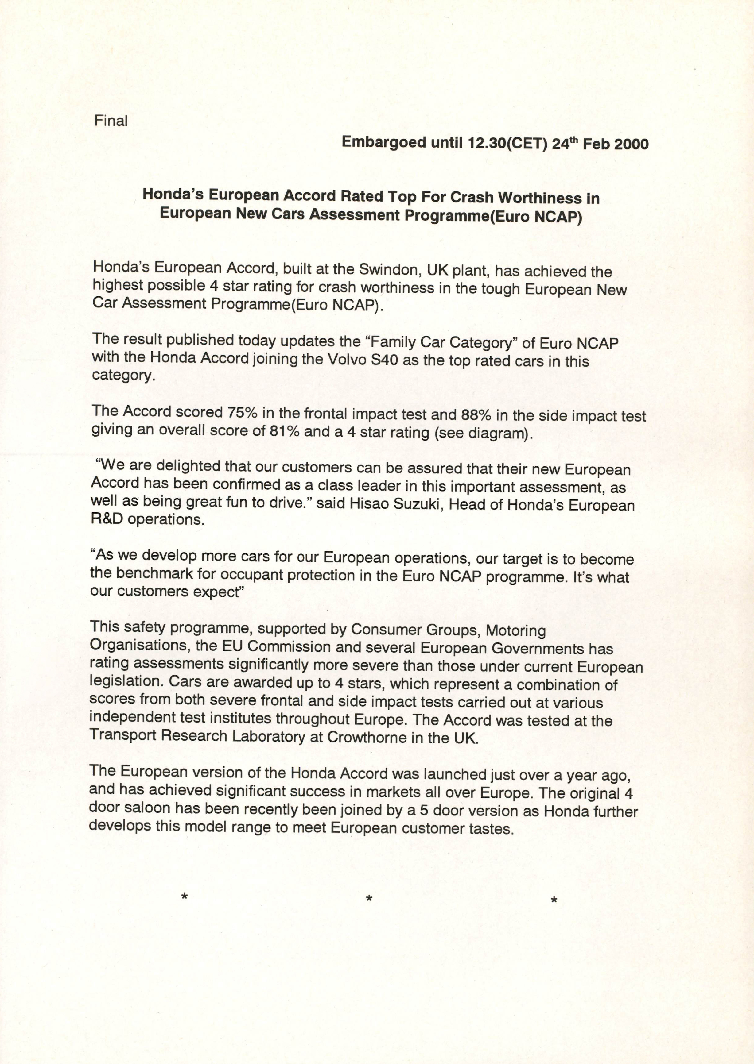 Feb 24, 2000 News Release Honda's European Accord Rated Top For Crash Worthiness in European New Cars Assessment Programme (Euro NCAP) Read the full press release in PDF (5.75 MB)