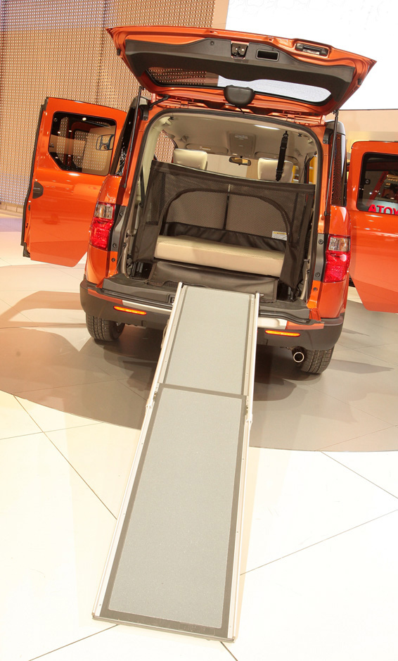 The Dog Friendly equipment, engineered specifically for the Element, is designed to accommodate the transportation of dogs in the second-row passenger seats or in the cargo area. The restraint system concepts were designed and fabricated by Takata Corporation, one of the world's leading automotive safety systems suppliers, exclusively for display on the Dog Friendly Honda Element concept vehicle. The restraint concepts are intended to complement the potential of the vehicle's existing restraint systems by helping to protect the dog and helping to prevent injuries to other vehicle occupants due to an unrestrained dog impacting them in a collision. For convenience, a ramp is included to help dogs access the rear cargo area. The ramp stores underneath the bed platform and can be conveniently accessed when the rear tailgate is down.