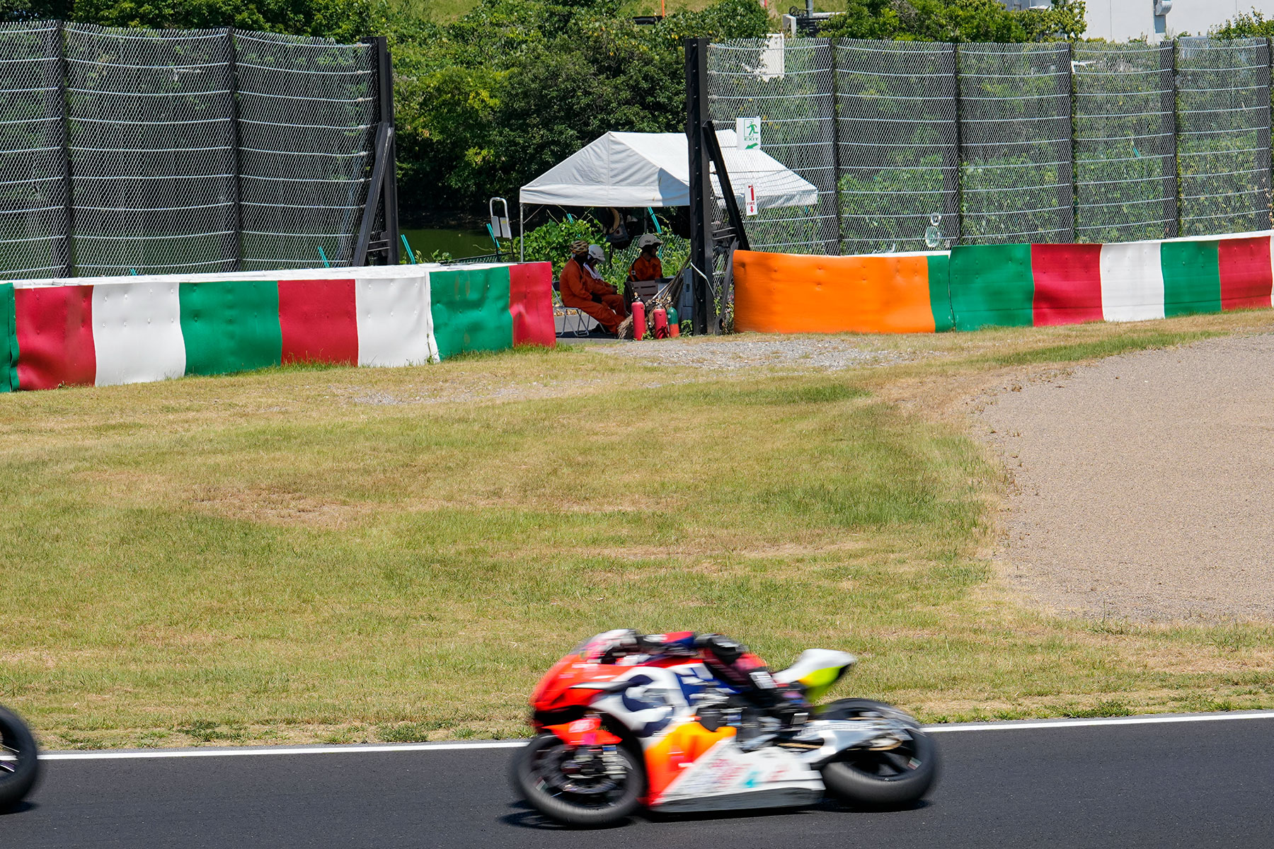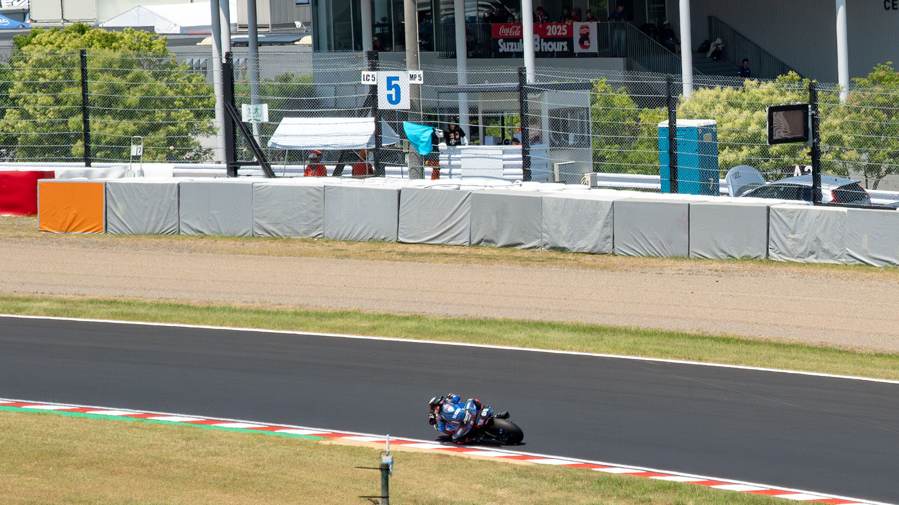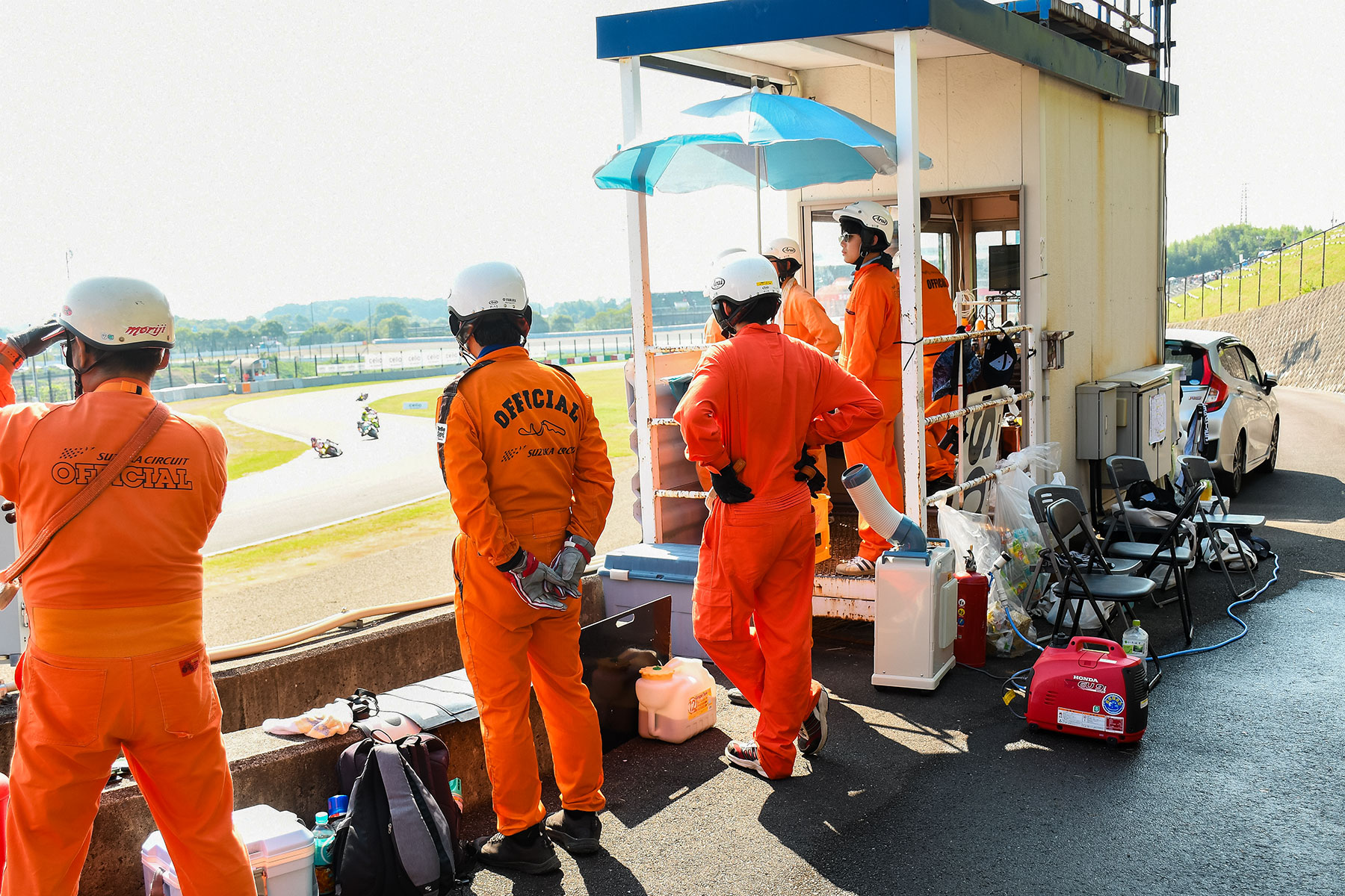 At the Suzuka 8 Hours, track officials stand by the trackside at 7:30 am, four hours before the race starts at 11:30 am. They remain stationed at there for over 12 hours, until well past 7:30 pm when the race ends, under the unrelenting blazing sun, to ensure rider safety.