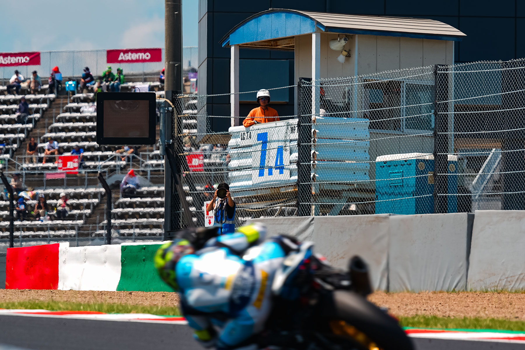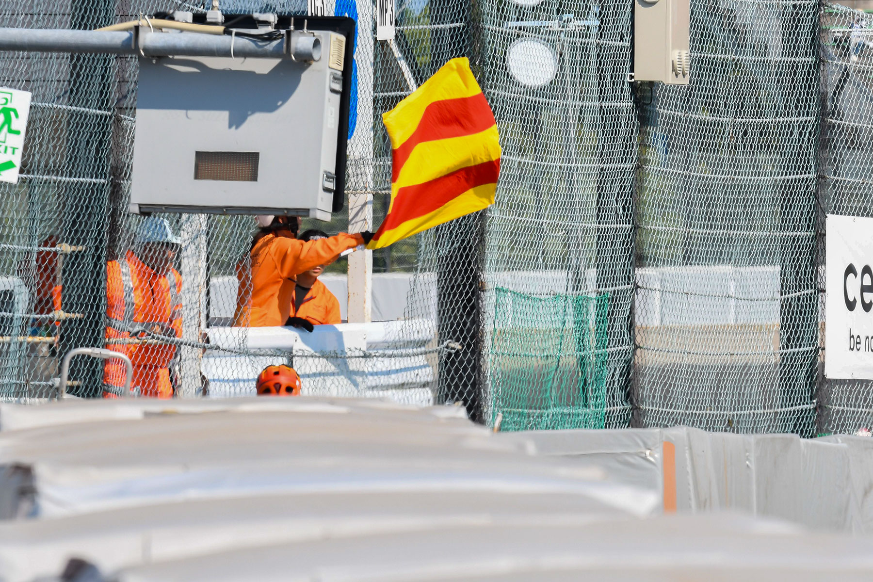 At the posts, with a primary role of flagging riders to alert them on dangers on track, power outlets are installed, but since these are mainly used to power the monitors displaying track conditions, a separate generator is installed for the fans and spot coolers to ensure the track monitors stay online.