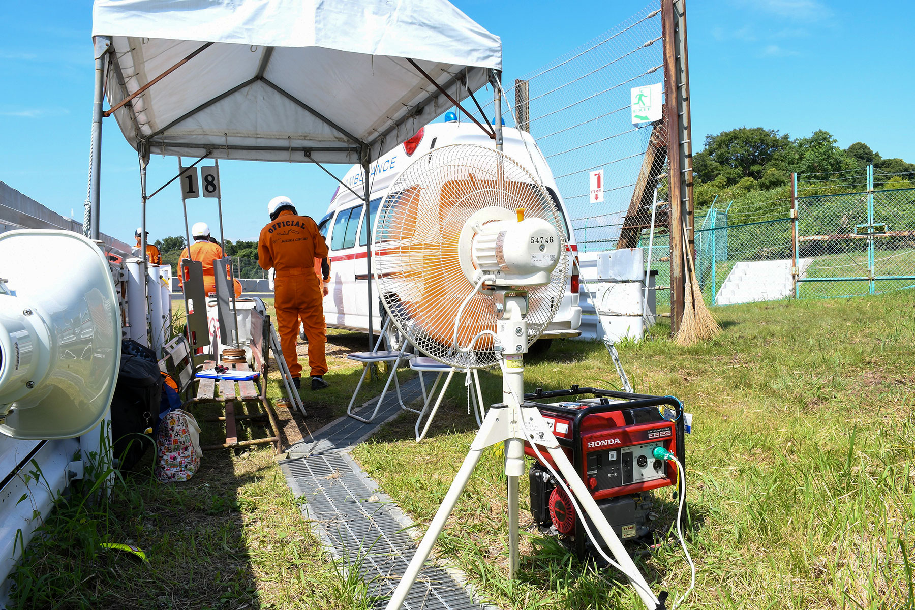 Posts and tents for the officials are exposed to the blazing sun. To make the officials’ work more comfortable, organizers install generators and fans in the tents. During the Suzuka 8 Hours, this equipment is indispensable.