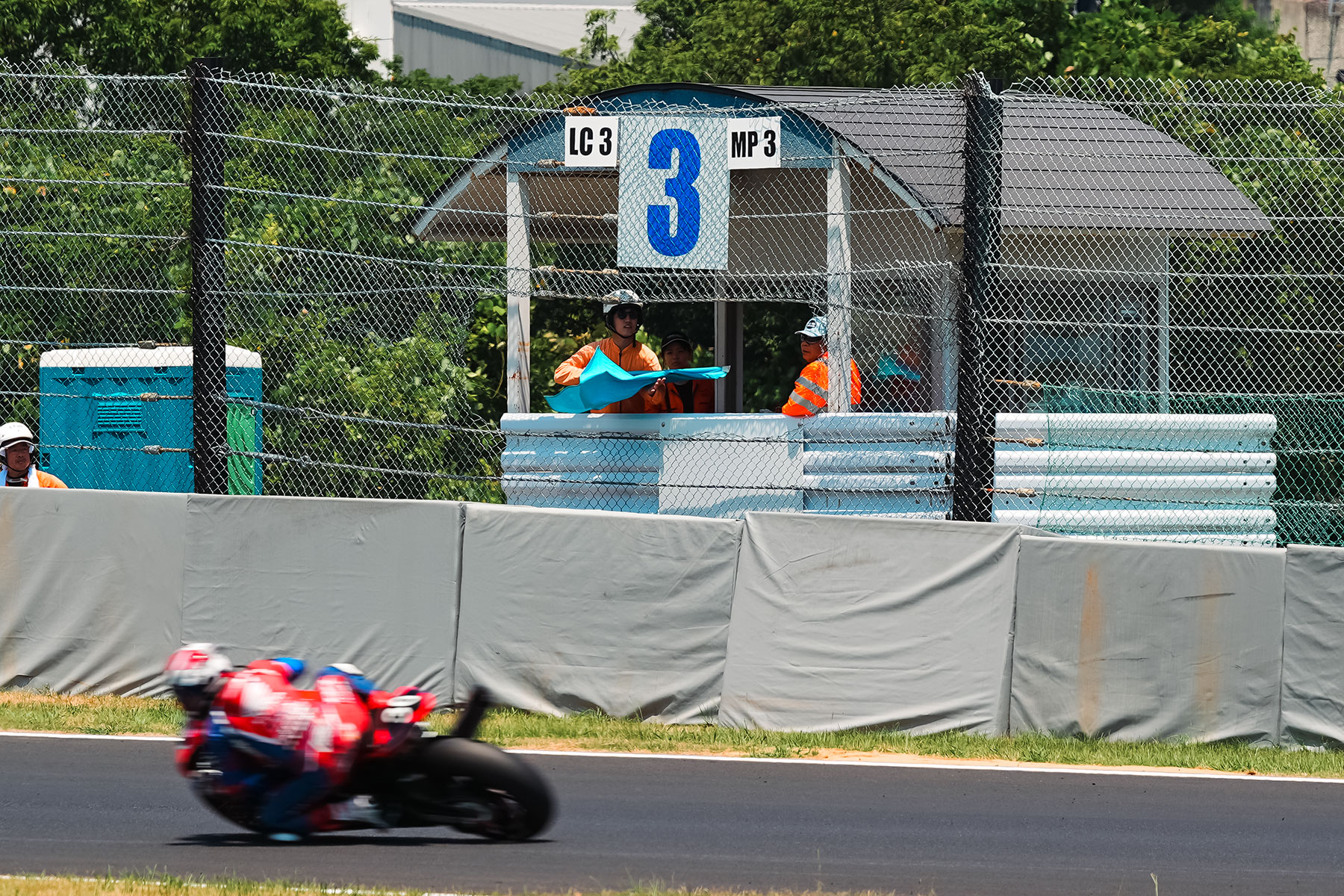 Track officials stationed at posts are often perceived as having an easier job than the marshals who rush to the scene of a crash. However, they constantly monitor approaching and passing bikes, ready to wave flags while waiting track-side.