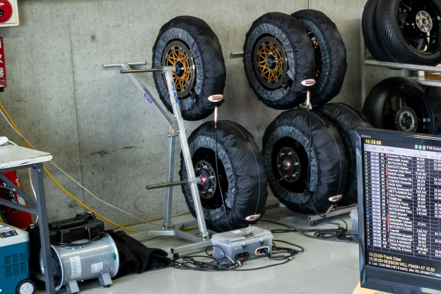 Among these devices, tire warmers are arguably the most critical for the race. Racing tires are designed to require constant temperature maintenance for safe operation. Consequently, not only at Suzuka 8 Hours but for all motorcycle races, tires are always prepared and covered with belt-like tire warmers before a race.