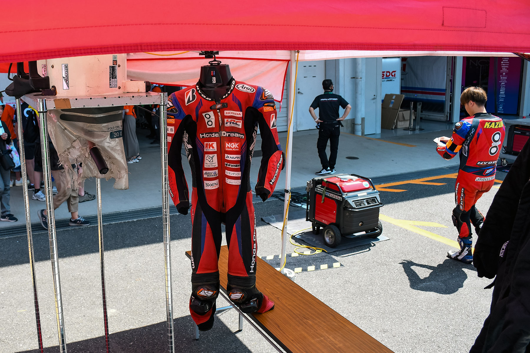 Even if riders have multiple racing suits, some riders use the same racing suit for multiple stints due to fit, so team staff need to perfectly maintain many racing suits. For this reason, many team use racing suite dryers, and many teams power these dryers with dedicated power sources.