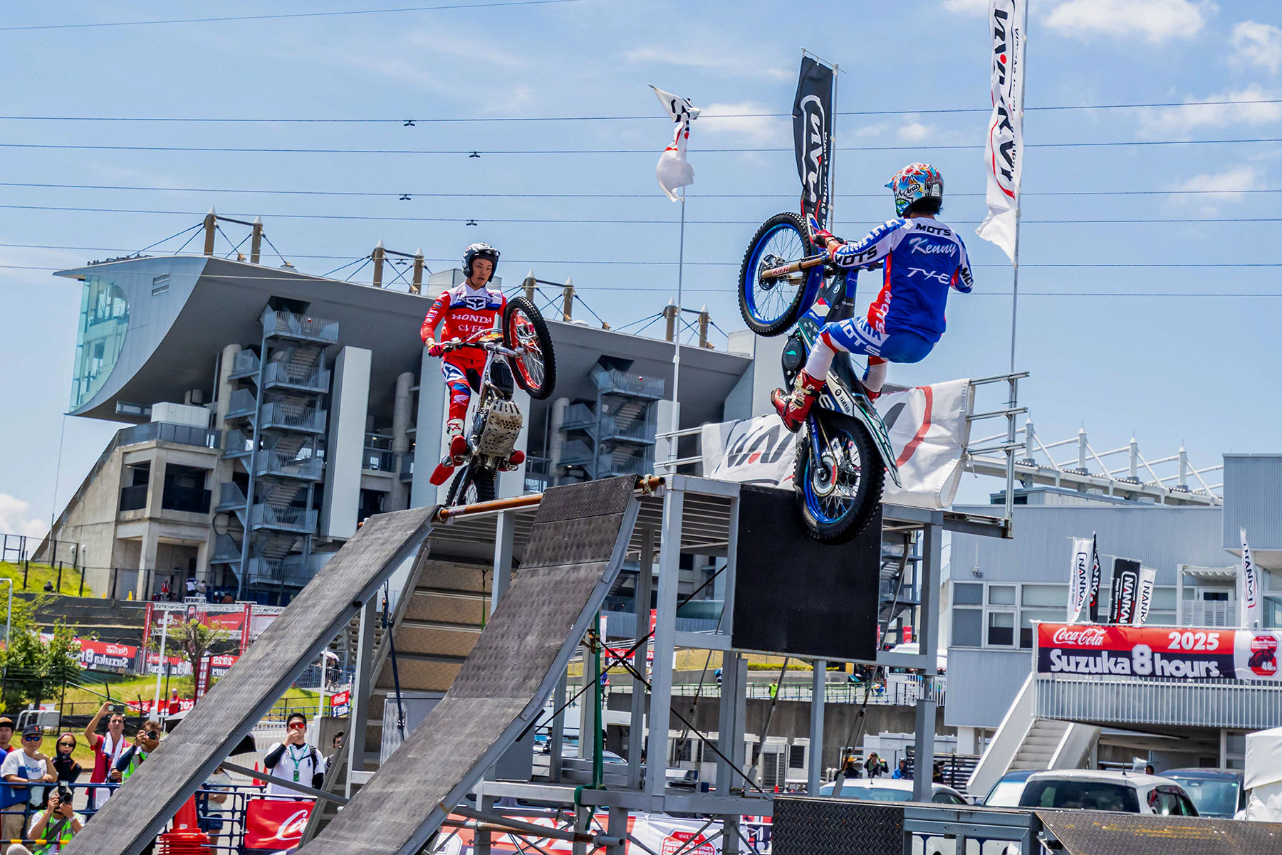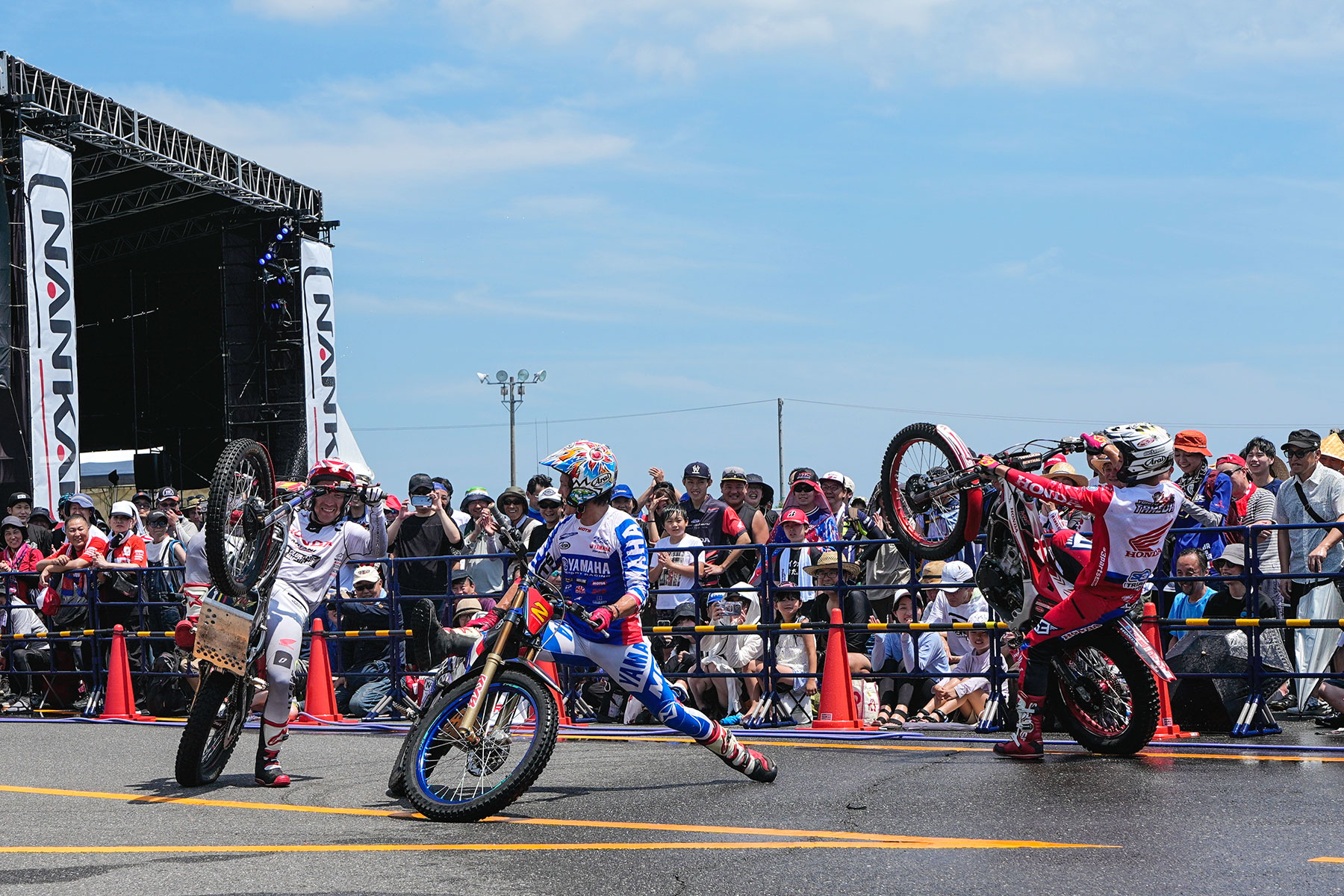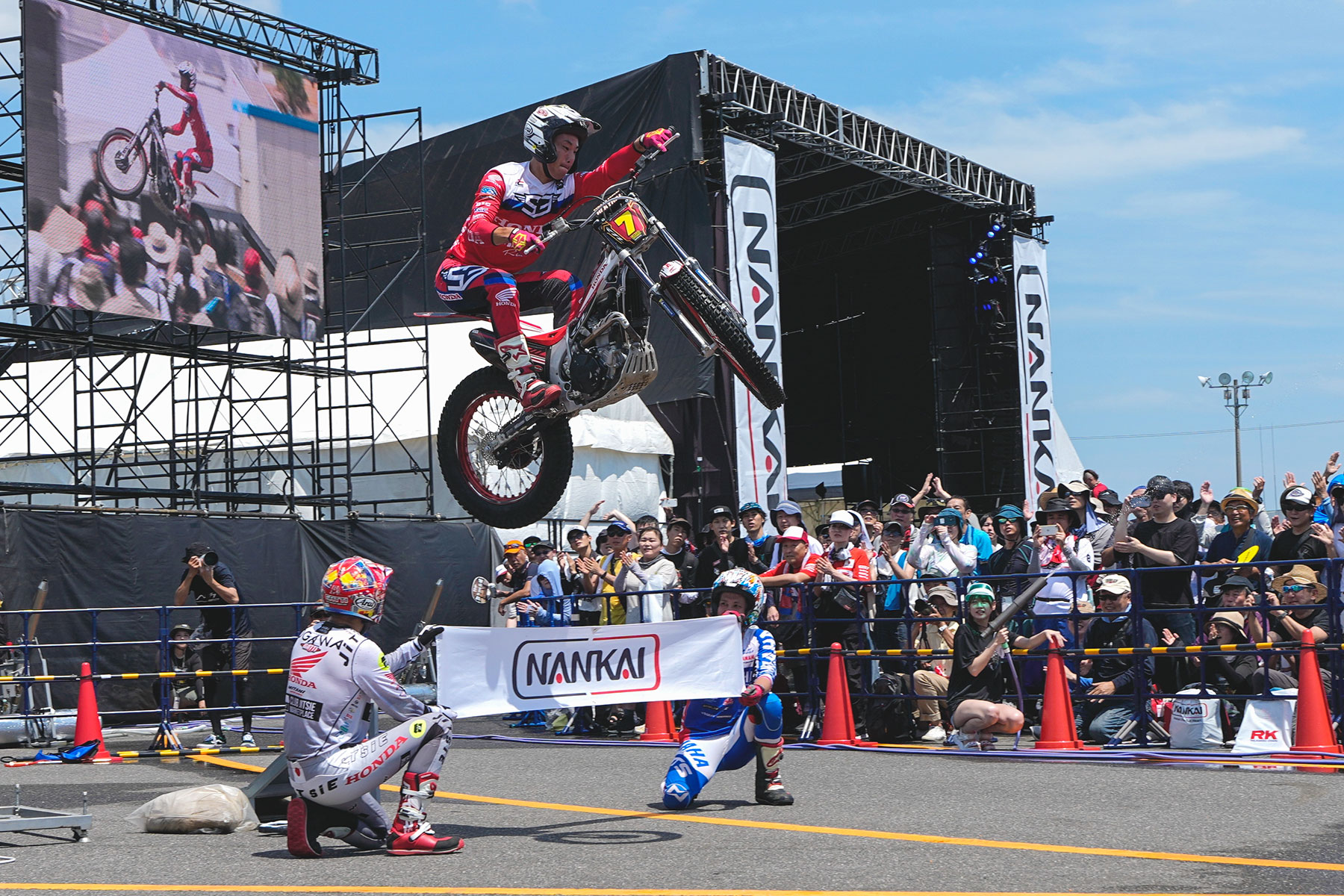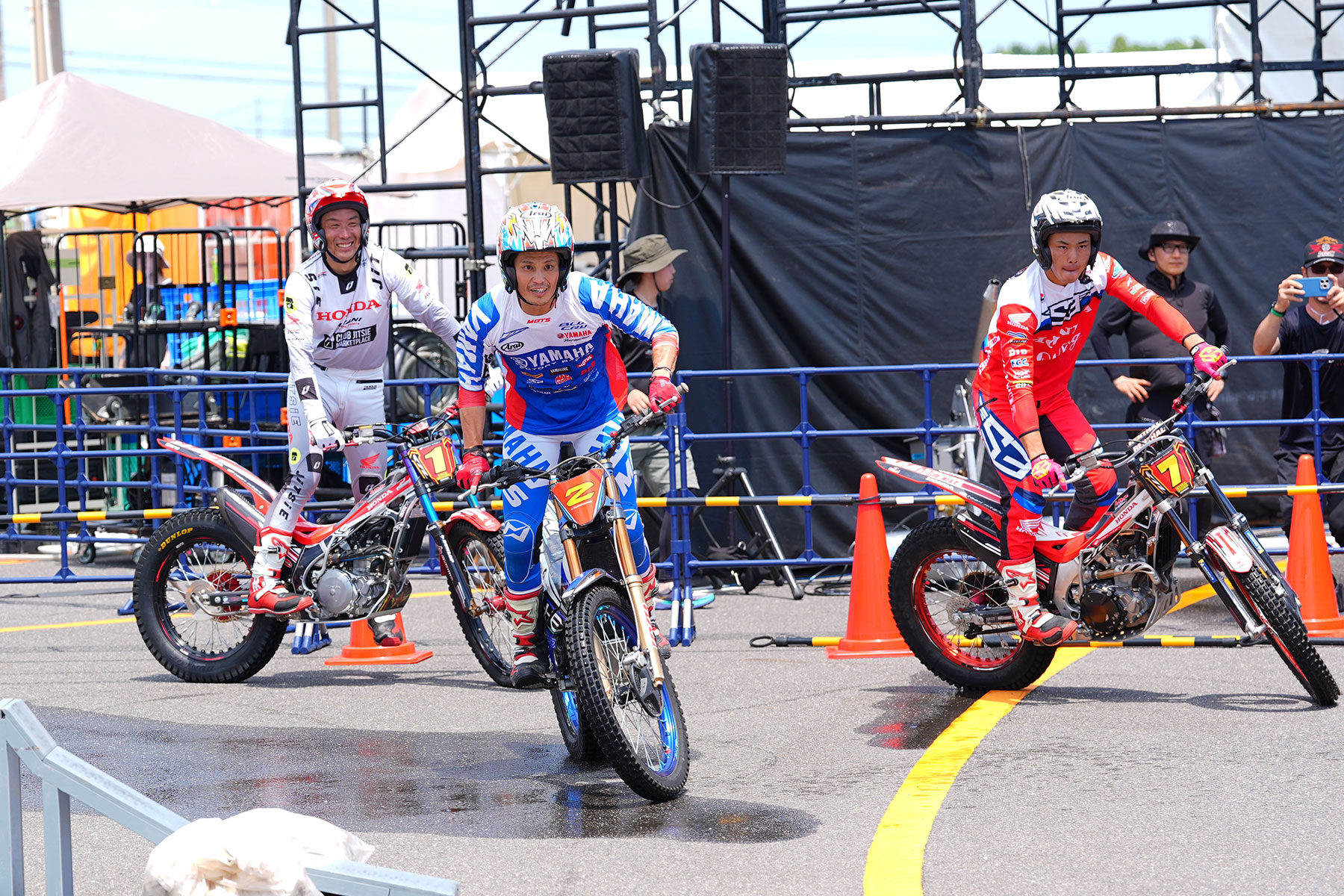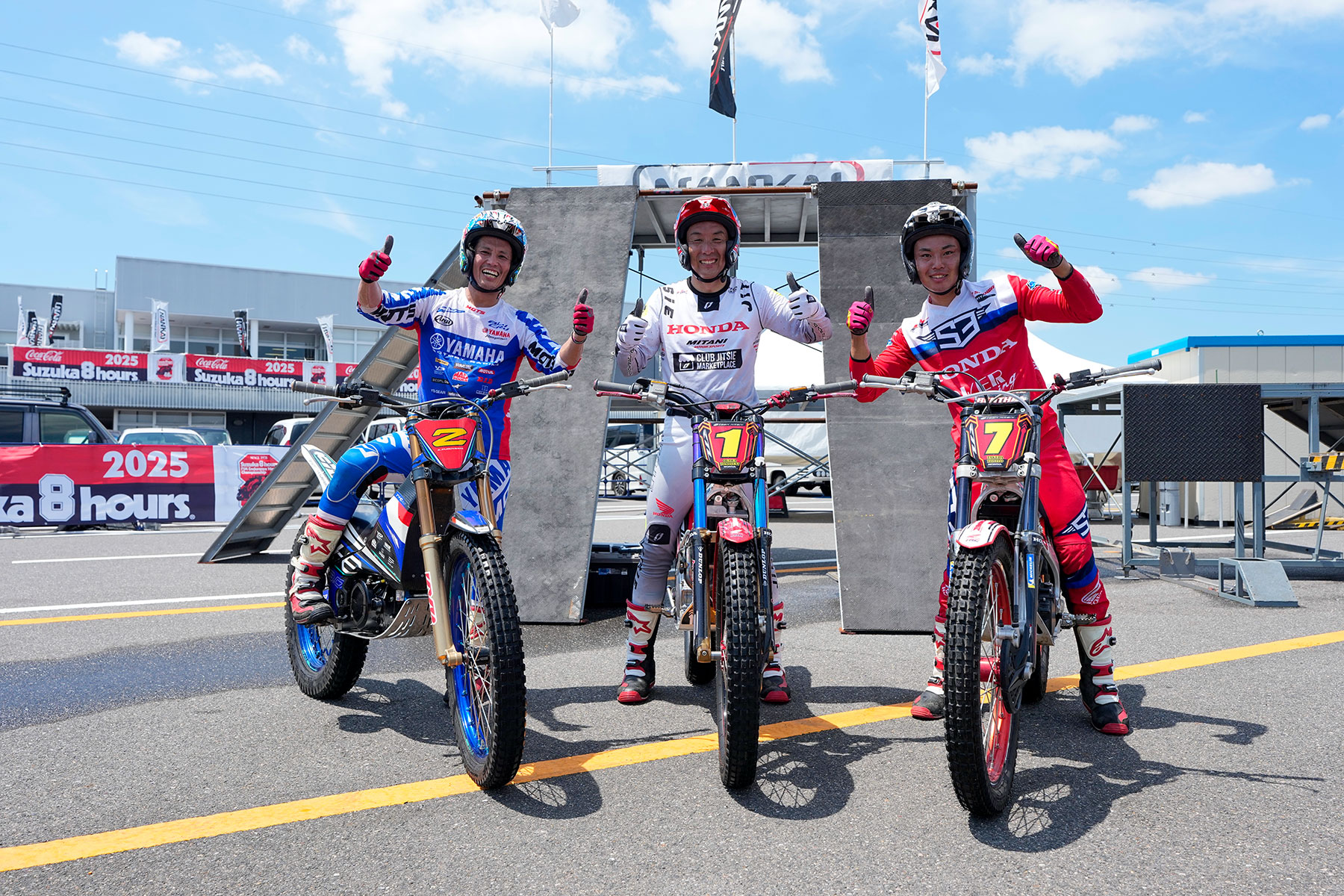 A popular attraction at this year’s Suzuka 8 Hours was the trial bike demonstration, NANKAI Trial Performance, held at the event venue. Team MITANI Honda rider Tomoyuki Ogawa, along with close ally and biggest rival in the All Japan Trial Championship Series, Kenichi Kuroyama (Yamaha), and his Team MITANI Honda teammate, Yohito Takeda, received thunderous applause from the large crowd.
