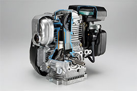 The GX240’s OHV mechanism and 25-degree inclined cylinder achieved a compact and lightweight construction while providing an ideal combustion chamber shape and excellent intake/exhaust efficiency, resulting in high performance and outstanding fuel economy (230 g/PS·h).