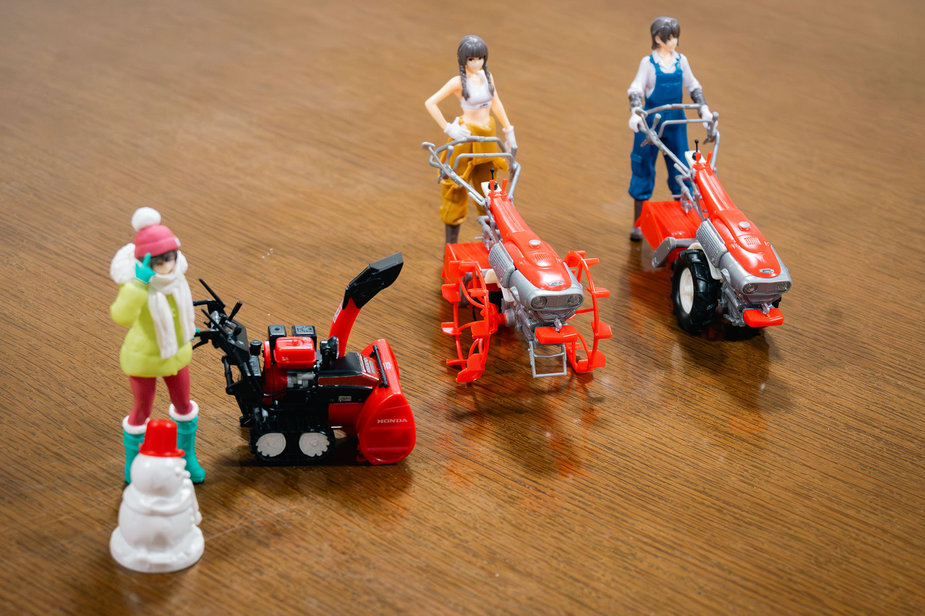 “The PLAMAX Minimum Factory series is all about figurines. The theme of the series is how characters can express their everyday life, with for example, a car or motorcycle placed their side to expand the worldview. But there are many other companies that are already making car and motorcycle models, so I was thinking that I wanted to combine the figurines with something else. Then, I happened to see a Honda tiller at the 2015 Tokyo Motor Show,” says Max Factory’s Yuki Takaku.