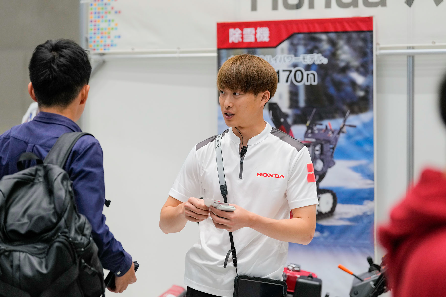 On entering the Honda Power Products booth, visitors are greeted with a Photo Spot zone where they can take selfies of operating a ride-on lawn mower at a soccer stadium, driving a tiller in a farm field, or operating a snowplow in a snowy mountain, and take these memories home. Here, many visitors, especially families, enjoy taking selfies and sharing them on social media or taking them home.