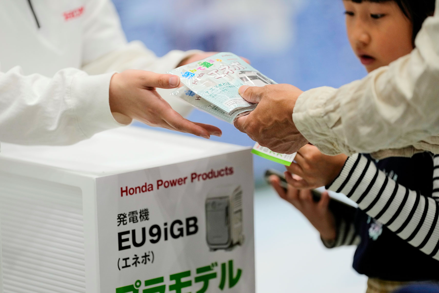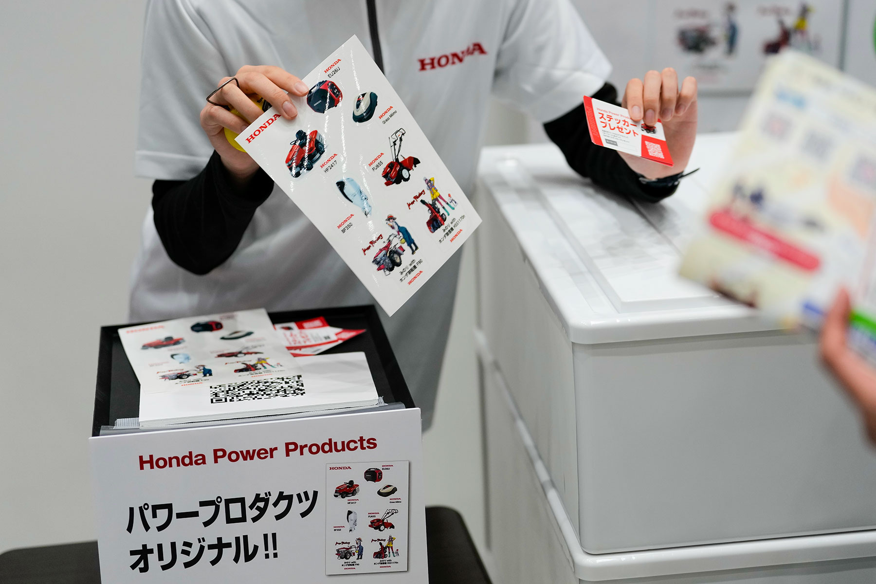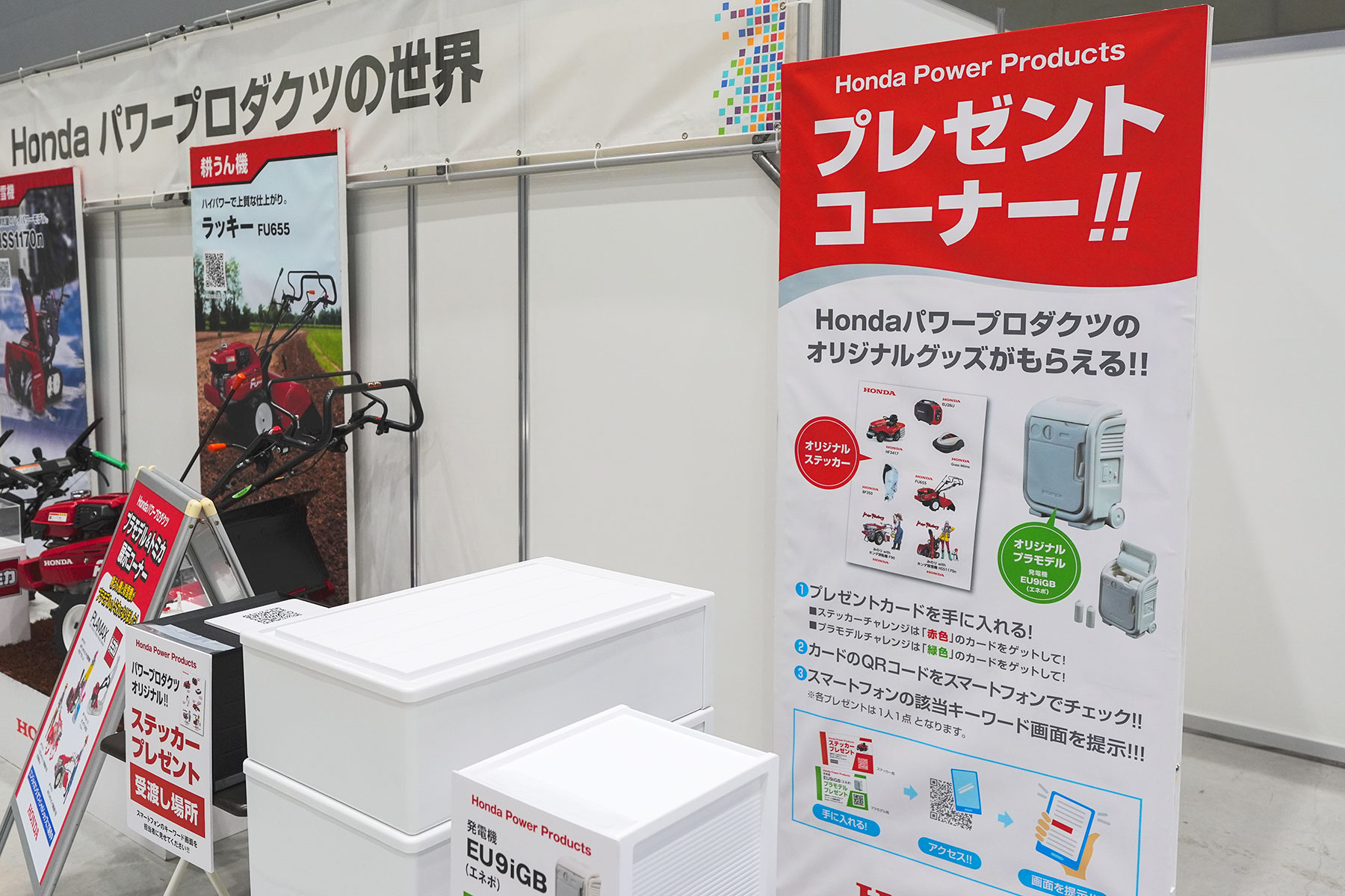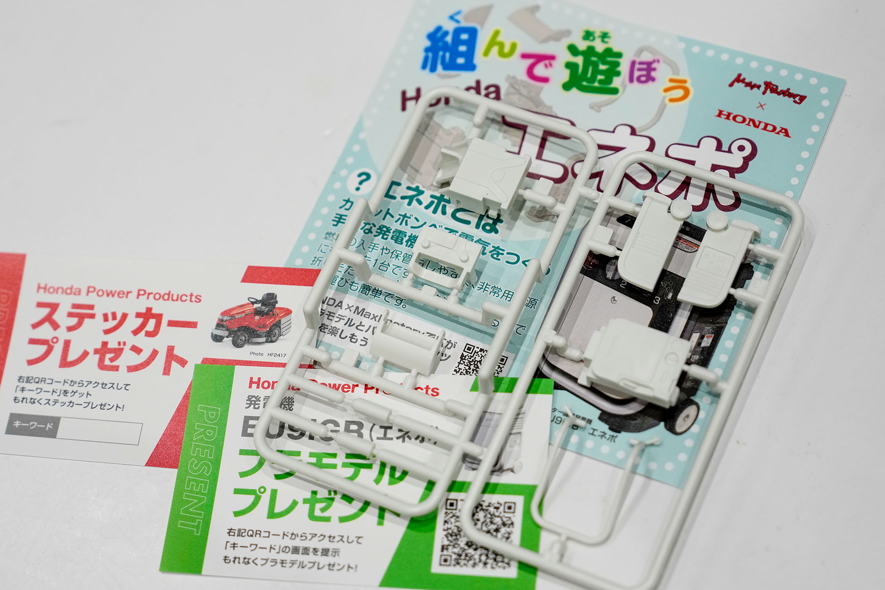 At the Enjoy Honda Power Products booth, visitors are handed cards with QR codes linking to the Honda Power Products website to find the keyword hidden in this article. By showing this keyword on their smartphone to the staff, visitors receive a plastic model with moving parts of the EU9i Enepo, supervised by Max Factory, and a decal featuring Honda Power Products.