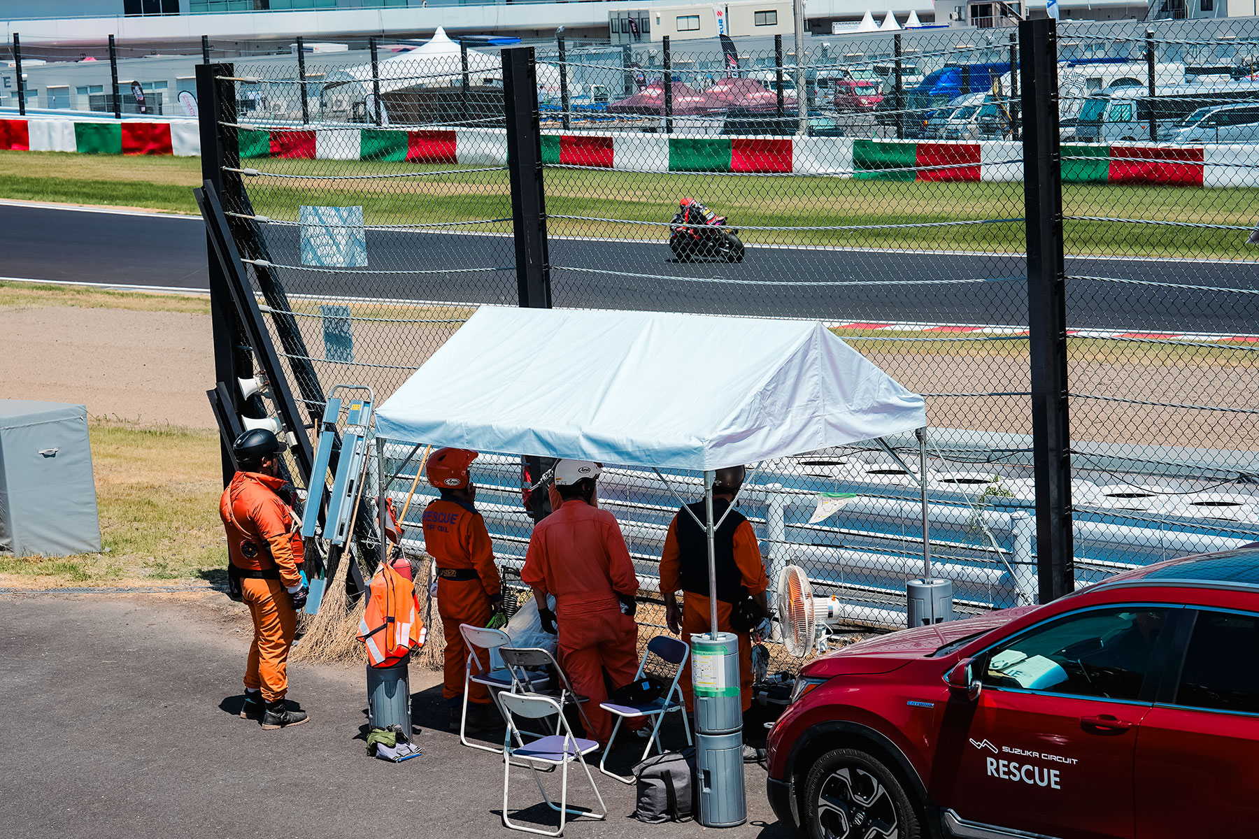 At the Suzuka 8 Hours, track officials stand by the trackside at 7:30 am, four hours before the race starts at 11:30 am. They remain stationed at there for over 12 hours, until well past 7:30 pm when the race ends, under the unrelenting blazing sun, to ensure rider safety.