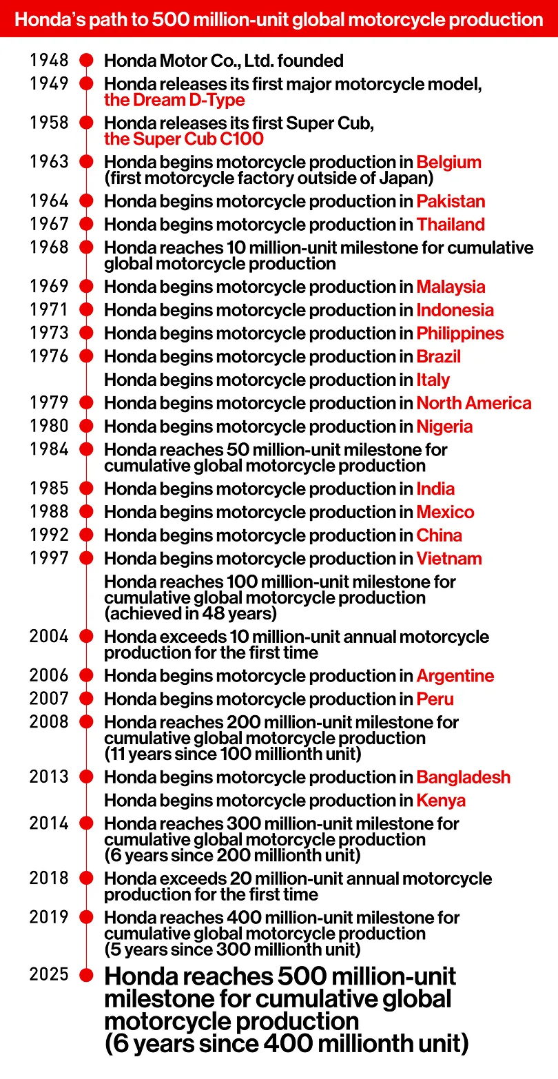 - In May 2025, Honda achieved cumulative global motorcycle production of 500 million units