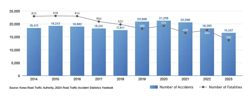 In Korea's motorcycle market, delivery bikes account for about 70% of the total number of bikes. Due to the high number of traffic violations by delivery riders, such as running red lights and speeding, motorcycles have gained a negative social image. While the number of motorcycle accident fatalities is decreasing due to various measures by the Korean government, including traffic accident prevention crackdowns, the overall number of accidents has not significantly decreased.