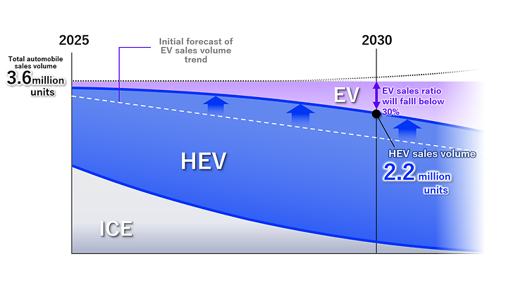 In light of the prediction that the full-scale popularization of EVs will take time, we will position our highly competitive HEVs at the core of our strategy. Specifically, we will work to 1) further enhance the competitiveness of our EV and HEV models with the core focus on application of intelligent technologies and 2) strengthen our business foundation through a reassessment of the powertrain portfolio.
