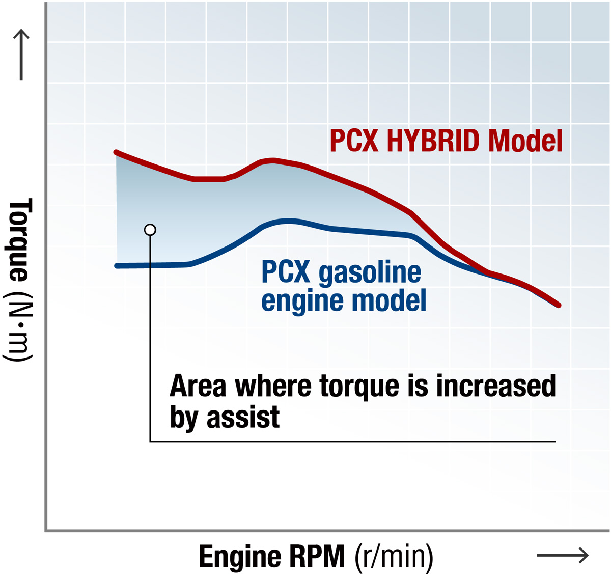 The motor assist achieves a 33% increase in torque at 4,000 rpm and a 22% increase at 5,000 rpm compared to the PCX's engine torque. This results improved acceleration performance and a more agile throttle response.