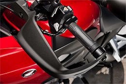 Instead of a clutch lever, the Dual Clutch Transmission models feature a pair of shifting switches and a parking brake lever mounted on the left handlebar.