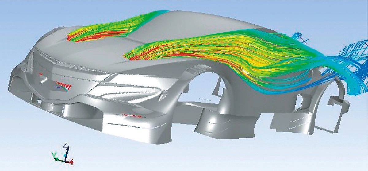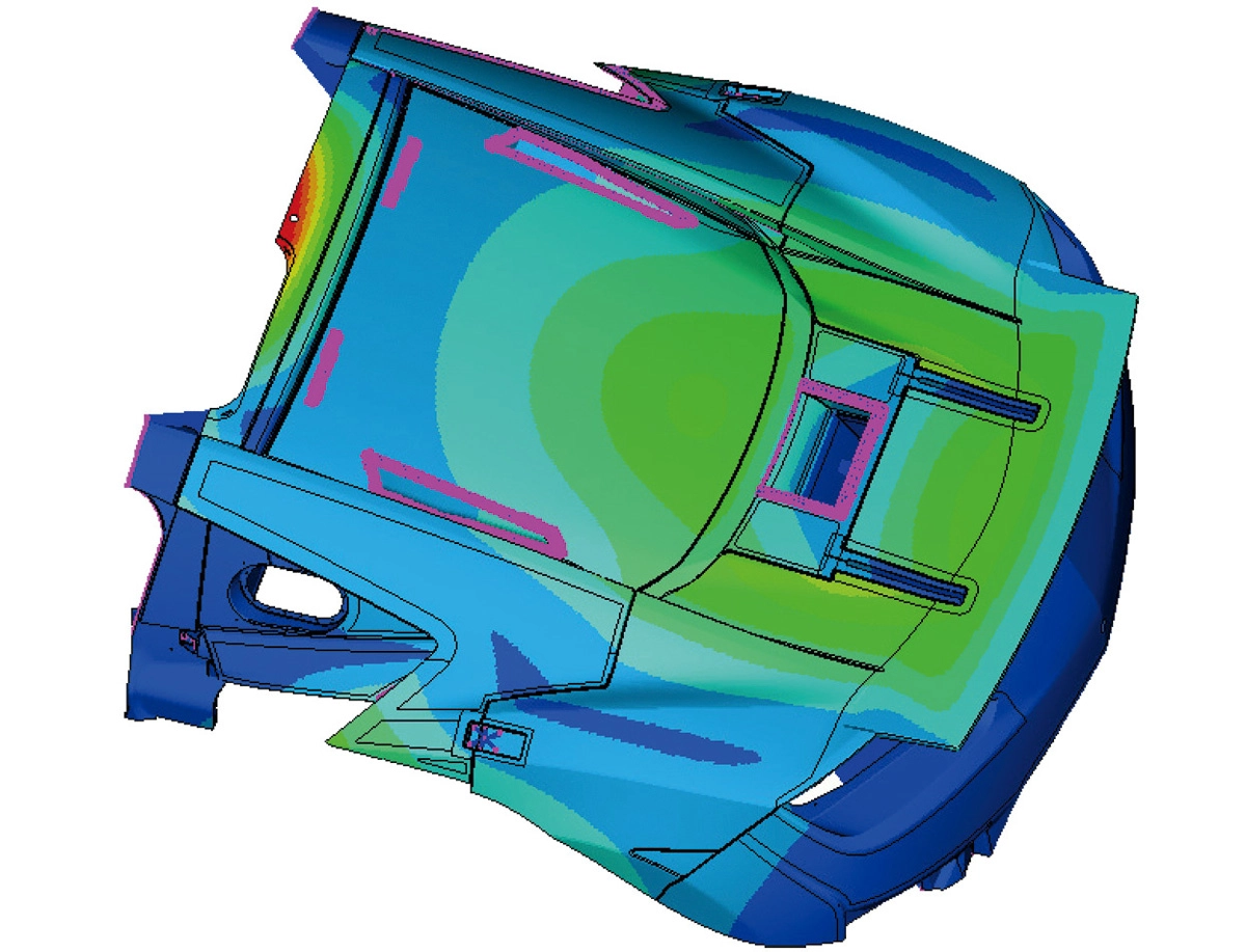 Simulations were also used when lightweighting the cowl. Pressure displacement distribution was analyzed using CFD to simulate loads equivalent to those at maximum speed.