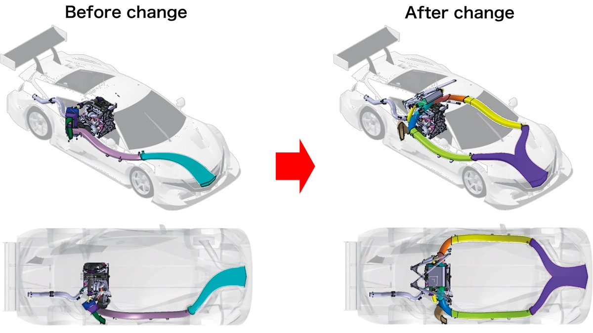 The intercooler was positioned on the left side of the car in 2018. The right side duct was used exclusively for air intake, enabling ram pressure (wind pressure when driving) to be used.