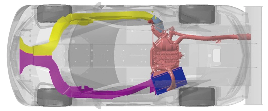 Manufacturing the advanced development car in 2013, it found cooling around the engine to be an urgent issue. The 2.0-liter inline four-cylinder direct injection turbocharged engine was mounted to the rear bulkhead of the common monocoque, with air intake positioned on the left side and exhaust on the right.