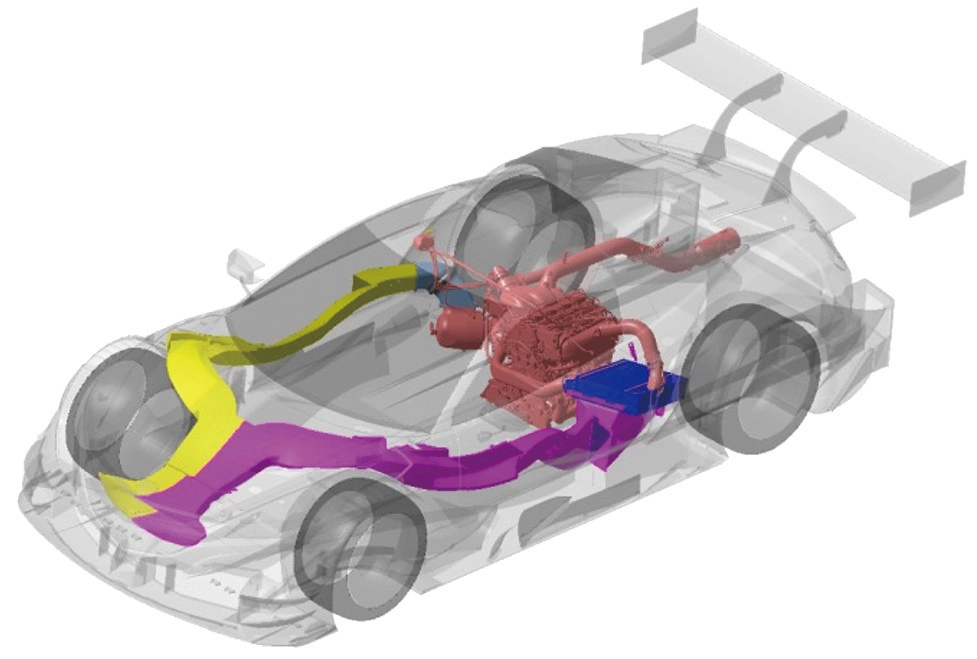 Intake air from the front bumper passes through the two-part radiator to undergo heat exchange, where it cools down the engine coolant while gaining heat from the hot radiator. As shown in the image, the heated air is exhausted via the hood outlets. The exhausted air then cools down as it undergoes heat exchange with the ambient air (color changes from red to yellow, green, and blue as the temperature drops). However, the CFD simulation shows that the air still has considerable heat in it around the side intake. High intake air temperatures increase the likelihood of engine knocking, so it is naturally preferable to keep intake air temperature as low as possible.