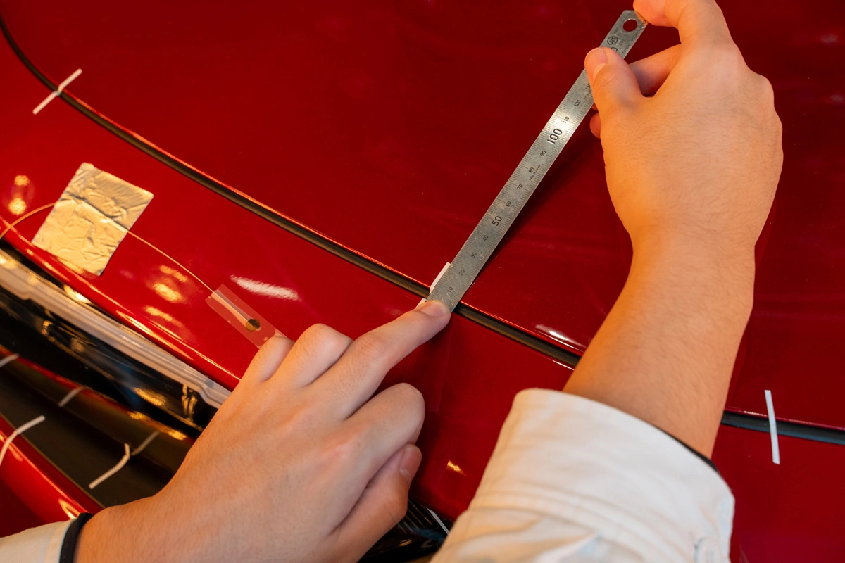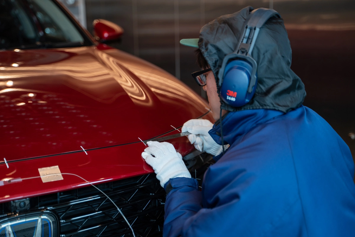 Because the strength of plastic parts diminishes as they expand due to heat, they are at risk of sagging. They might even become warped in a wave-like pattern. There is also the possibility of parts getting in the way of each other in between the seams, leading to peeling away of coatings or scratching. At low temperature, plastic parts contract, increasing the gap between them. Changes to seams and alignments due to deformation of parts as a result of temperature changes diminish marketability. Checking that this will not happen is the purpose of low- and high-temperature visual marketability testing. Personnel use a scale to carefully measure the displacement of seams and alignments caused by temperature changes, particularly in areas where the displacement would have a significant impact on marketability. Honda has its own original numerical standards for determining the adequacy of functionality and marketability, but visual checks by personnel are always undertaken as sometimes the human eye notices that something is not right even when the standards are met.