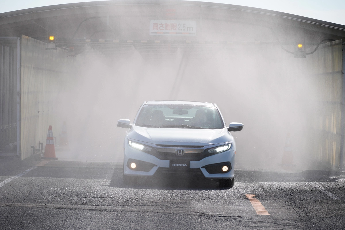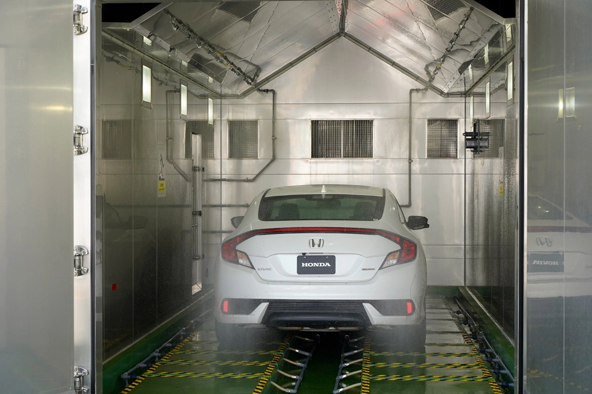 Corrosion leads to a deterioration of marketability and degradation of metal caused by corrosion can lead to deterioration of driving safety functions. By recreating the burdens placed on vehicles associated with the day-to-day lifestyles of customers, such as rain, sunlight, and driving on roads sprayed with deicing agent, Honda seeks to enhance its knowledge about corrosion mechanisms and to observe the condition of the exterior and components related to driving functions in vehicles under development. Besides confirming that driving safety functions for driving, turning, and stopping will not be affected, Honda checks that marketability will not be diminished.