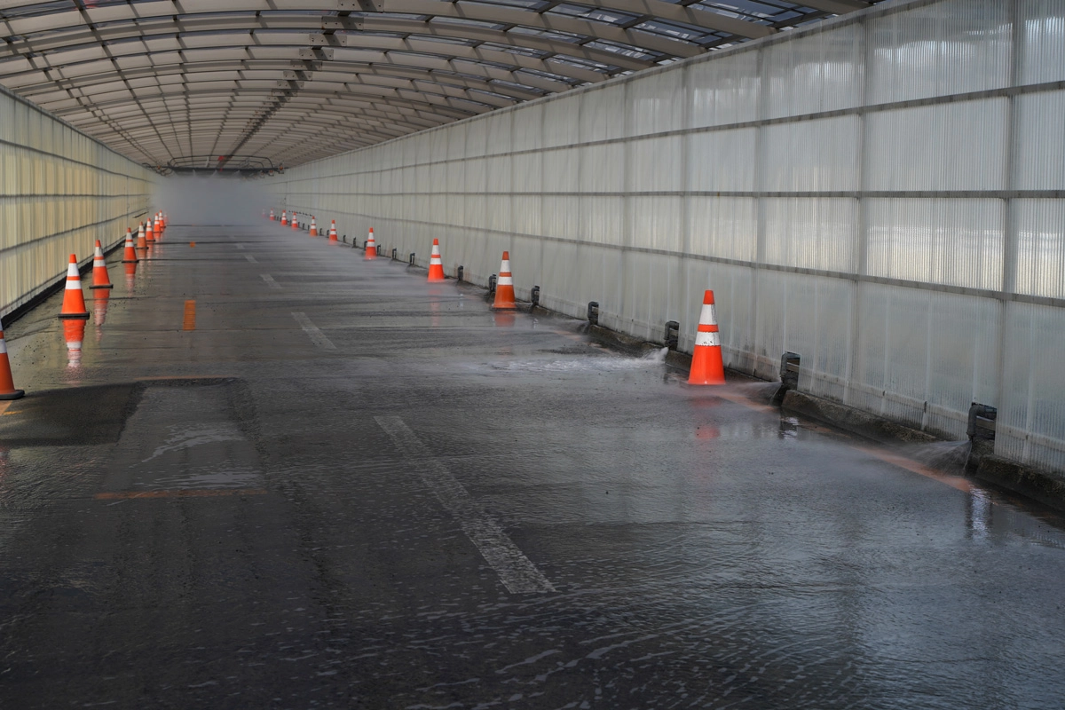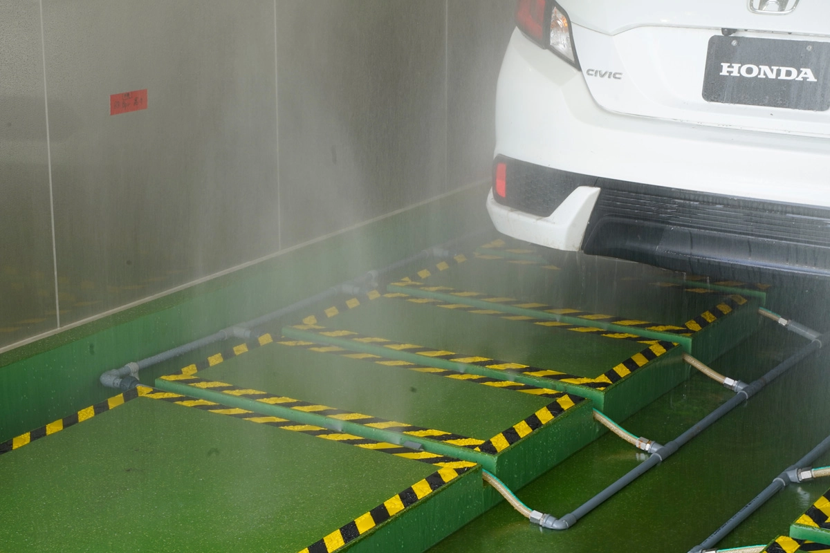 The purpose of the salt water shower is to have salt adhere to the vehicle body. As well as showering the vehicle with salt water rain, salt water is made to infiltrate the engine compartment.